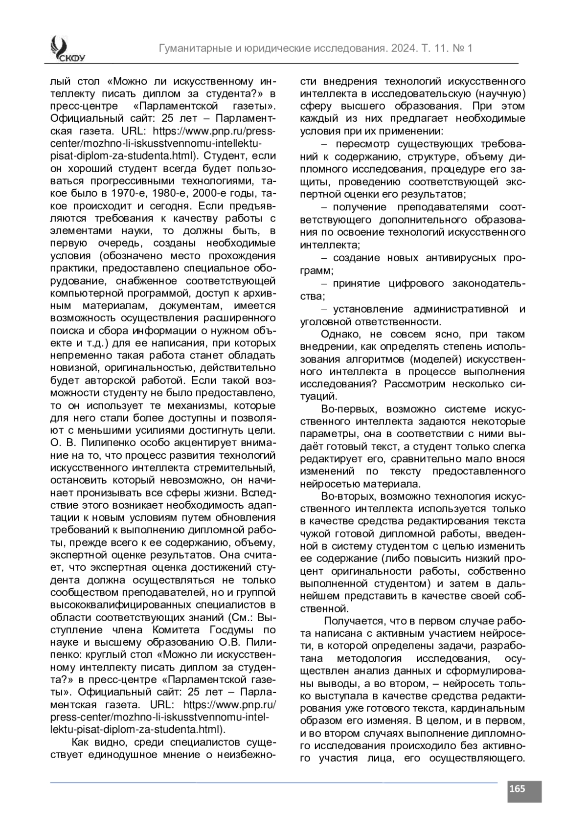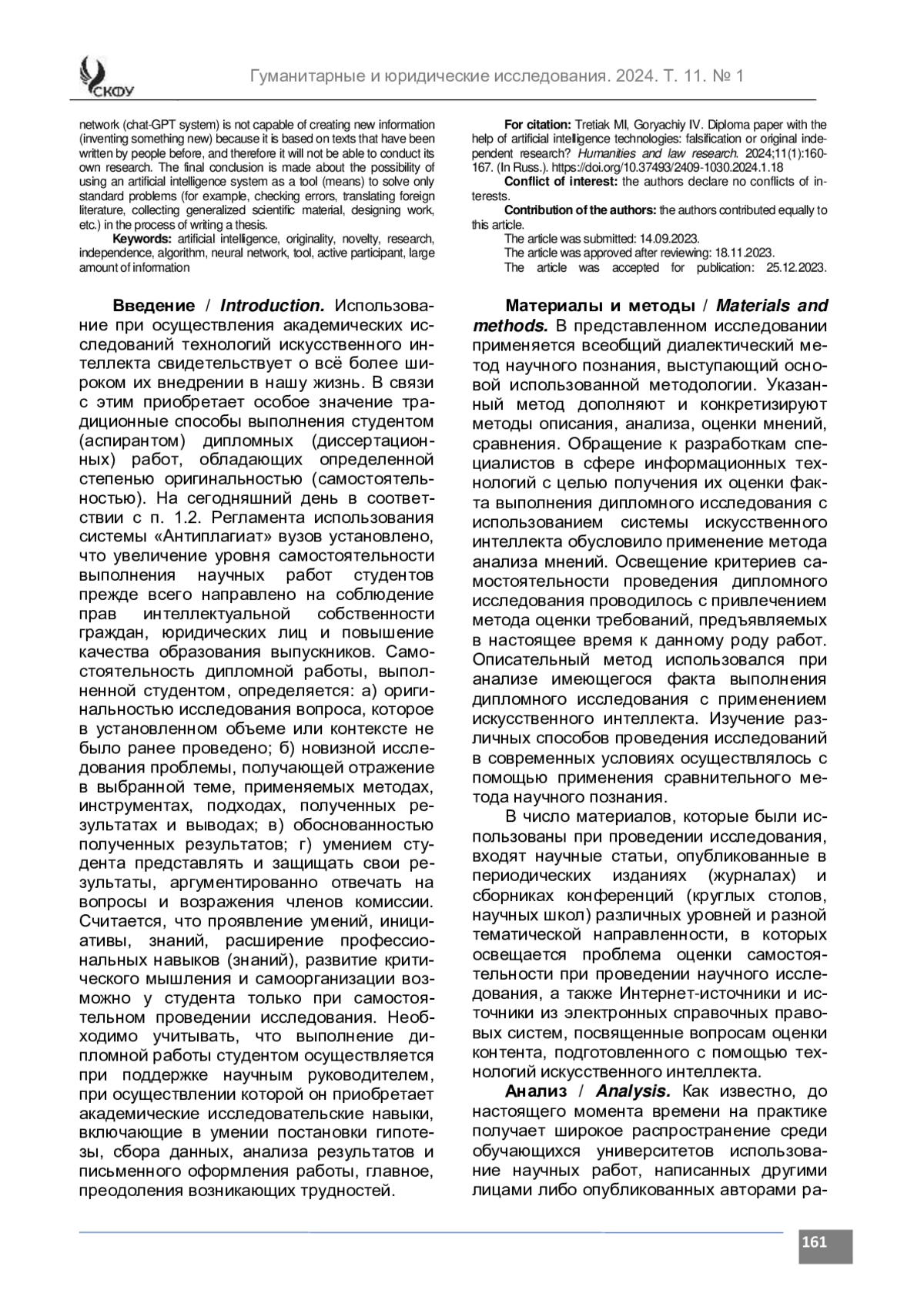 Результаты. Автор считает, что написание нейросетью оригинального исследования особенно в правовой сфере без активного участия человека, невозможно. Поскольку оригинальность исследования означает проведение его впервые с применением новых методов, инструментов и получением новых результатов и выводов. Нейронная сеть (система чат-GPT) не способна создавать новую информацию (изобретать что-то новое), поскольку основана на текстах, которые были написаны ранее людьми, а, следовательно, она не сможет провести свое собственное исследования. Делается итоговый вывод о возможности использования системы искусственного интеллекта в качестве инструмента (средства) при решении только стандартных задач (например, при проверке ошибок, переводе иностранной литературы, сборе обобщенного научного материала, оформление работы и др.) в процессе написания дипломной работы студентом.