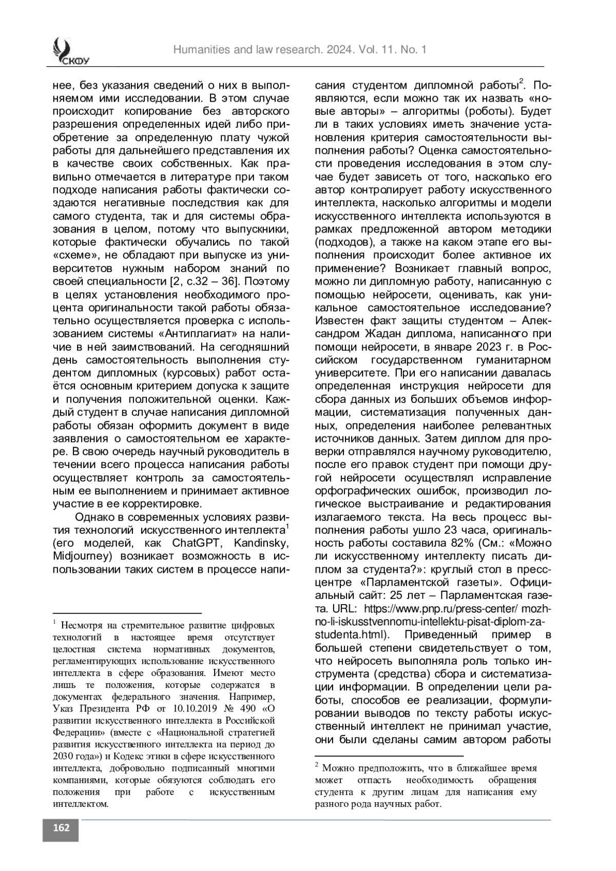 Что же касается написания нейросетью уникального, оригинального дипломного (диссертационного) исследования особенно в правовой сфере без активного участия человека, то считаем, что такое невозможно. Поскольку самостоятельность (оригинальность) дипломного (диссертационного) исследования, заключается в осуществлении его впервые, обладающего новизной, получающей отражение в выбранной теме, применяемых новых методах, инструментах, подходах, обоснованных результатах и выводах