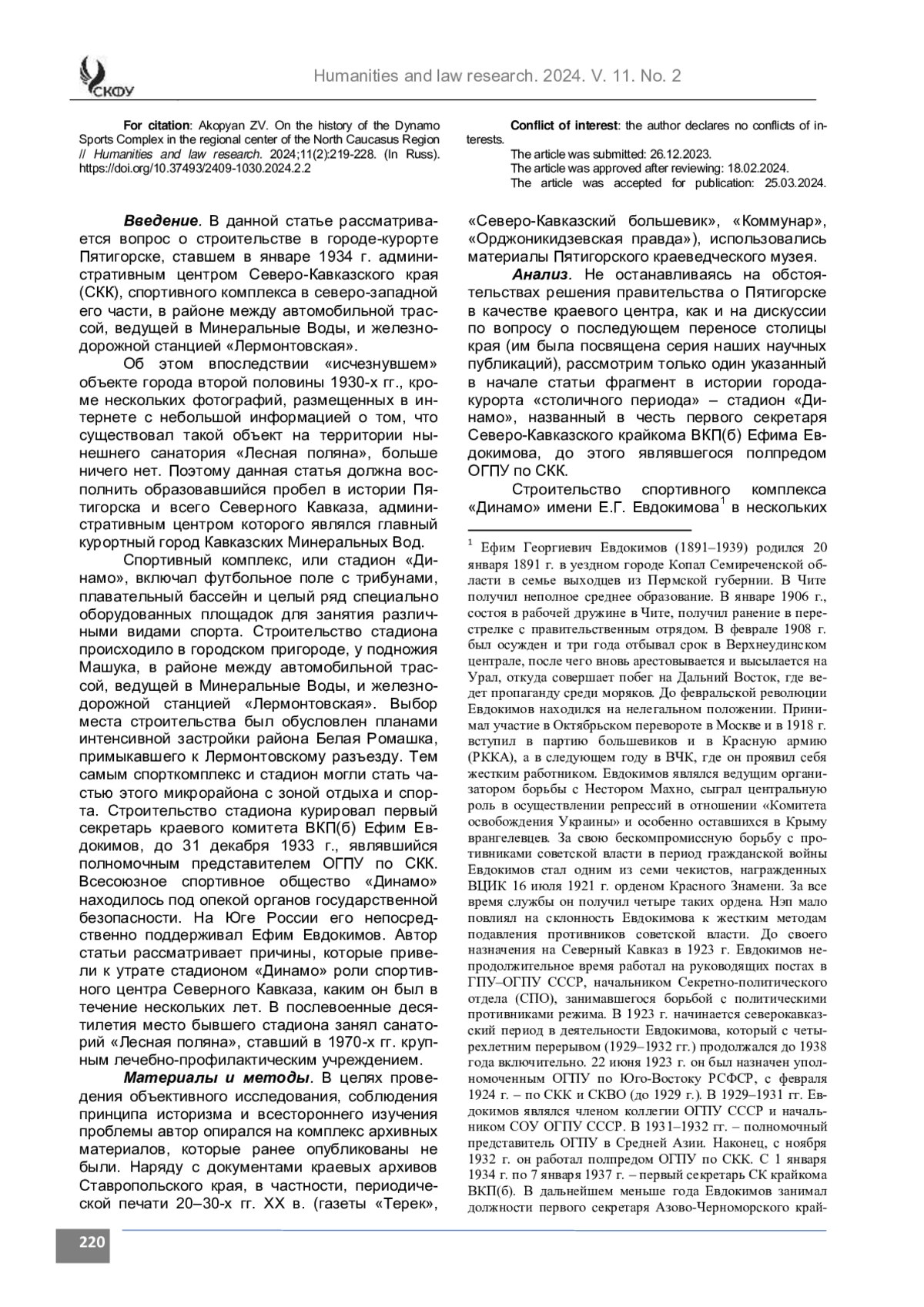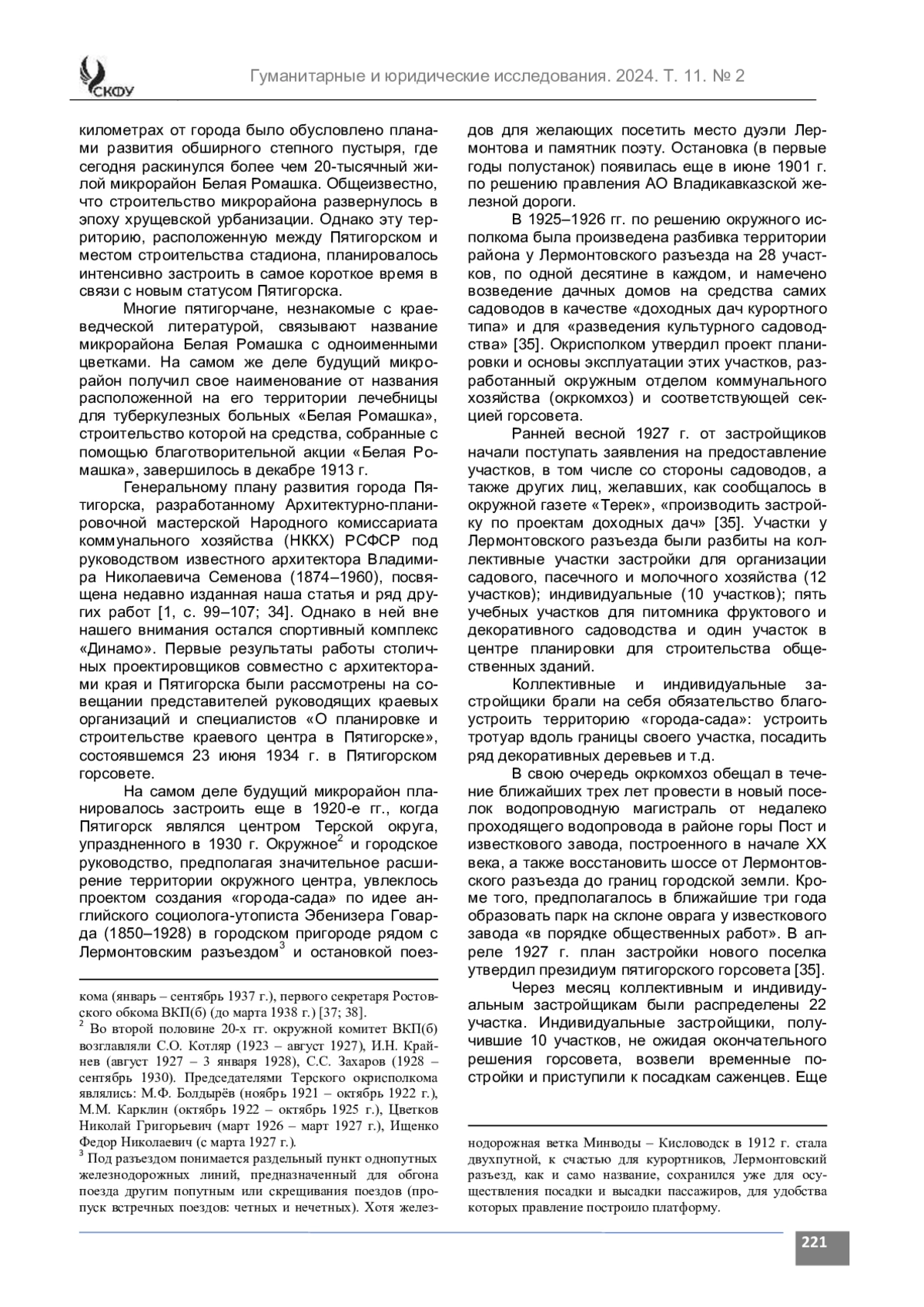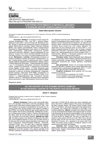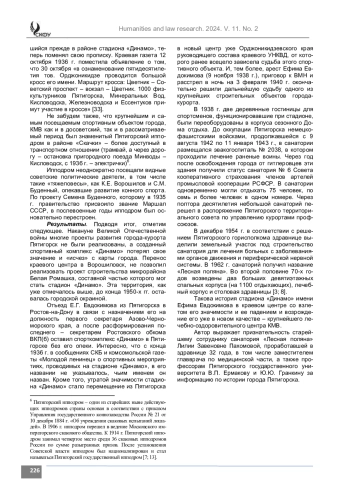 Введение. В описании истории города Пятигорска, являвшегося в 1934 – мае 1937 гг. центром СевероКавказского края (СКК), в научной литературе образовался пробел. Исходя из перспективы расширения города в направлении района Лермонтовского разъезда, первый секретарь крайкома ВКП(б), еще недавно возглавлявший органы государственной безопасности Северо-Кавказского края, вместе со своими бывшими подчиненными, содействовал строительству крупного спортивного комплекса «Динамо». Однако информация об этом объекте, которого уже в после окончания Великой Отечественной войны не было, отсутствует в историко-краеведческой литературе.