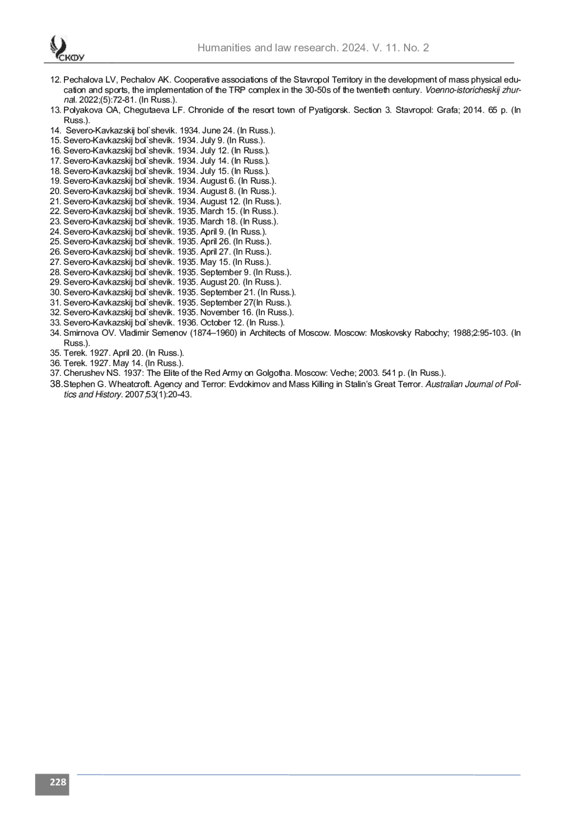 12. Печалова Л. В., Печалов А. К. Кооперативные объединения Ставропольского края в развитии массовой физкультуры и спорта, реализации комплекса ГТО В 30-50-е годы ХХ века // Военно-исторический журнал. № 5. 2022. С. 72-81.