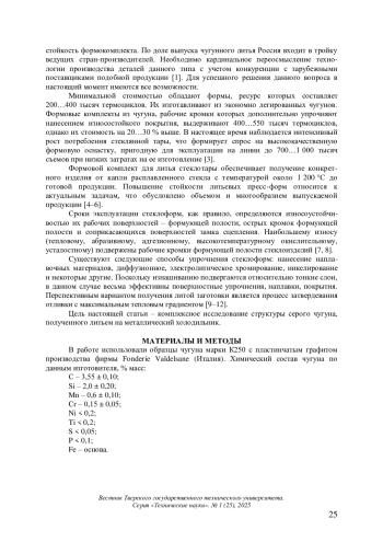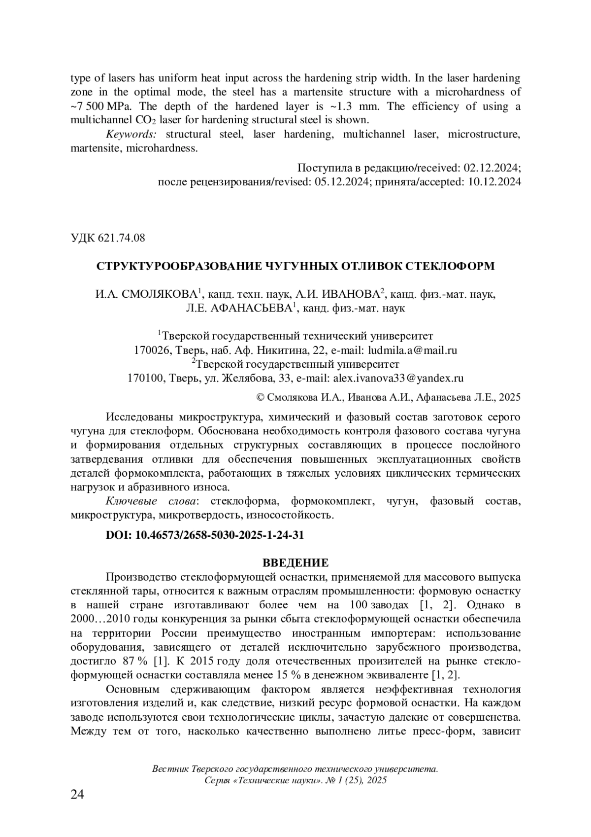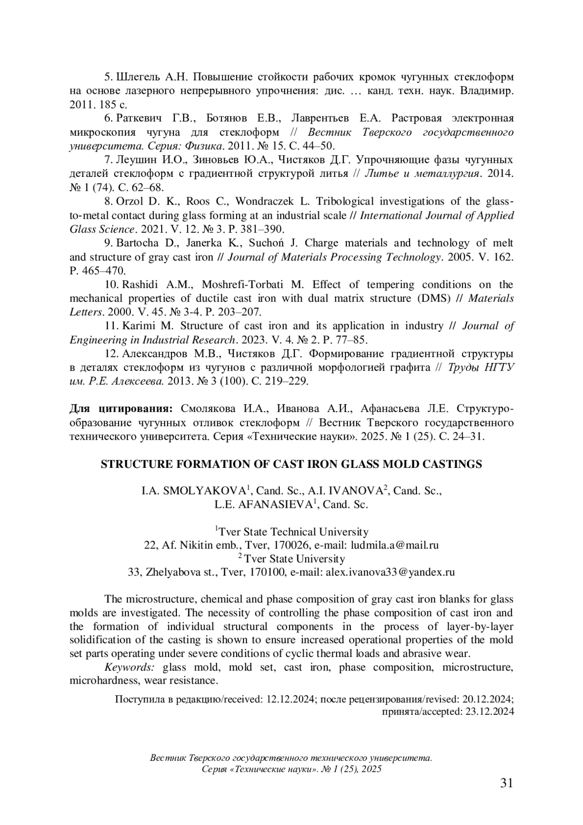 7. 	Леушин И.О., Зиновьев Ю.А., Чистяков Д.Г. Упрочняющие фазы чугунных деталей стеклоформ с градиентной структурой литья // Литье и металлургия. 2014. № 1 (74). С. 62-68.  EDN: SQBXIN