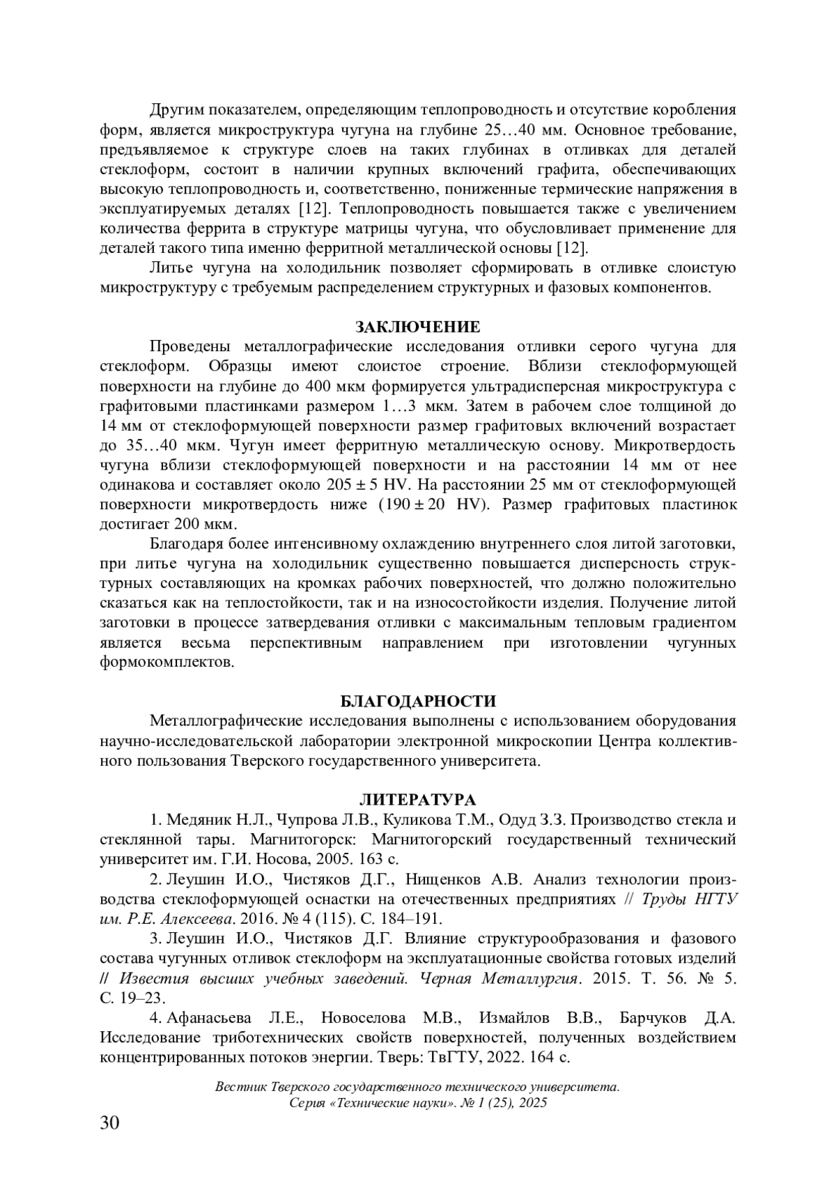 3. 	Леушин И.О., Чистяков Д.Г. Влияние структурообразования и фазового состава чугунных отливок стеклоформ на эксплуатационные свойства готовых изделий // Известия высших учебных заведений. Черная Металлургия. 2015. Т. 56. № 5. С. 19-23.