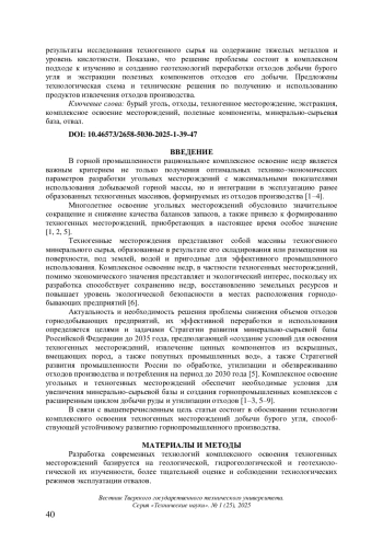 В горной промышленности рациональное комплексное освоение недр является важным критерием не только получения оптимальных технико-экономических параметров разработки угольных месторождений с максимальными показателями использования добываемой горной массы, но и интеграции в эксплуатацию ранее образованных техногенных массивов, формируемых из отходов производства [1–4].