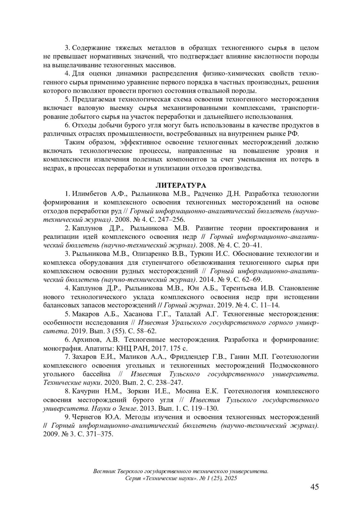 1. Илимбетов А.Ф., Рыльникова М.В., Радченко Д.Н. Разработка технологии формирования и комплексного освоения техногенных месторождений на основе отходов переработки руд // Горный информационно-аналитический бюллетень (научно-технический журнал). 2008. № 4. С. 247-256. EDN: JUPWML