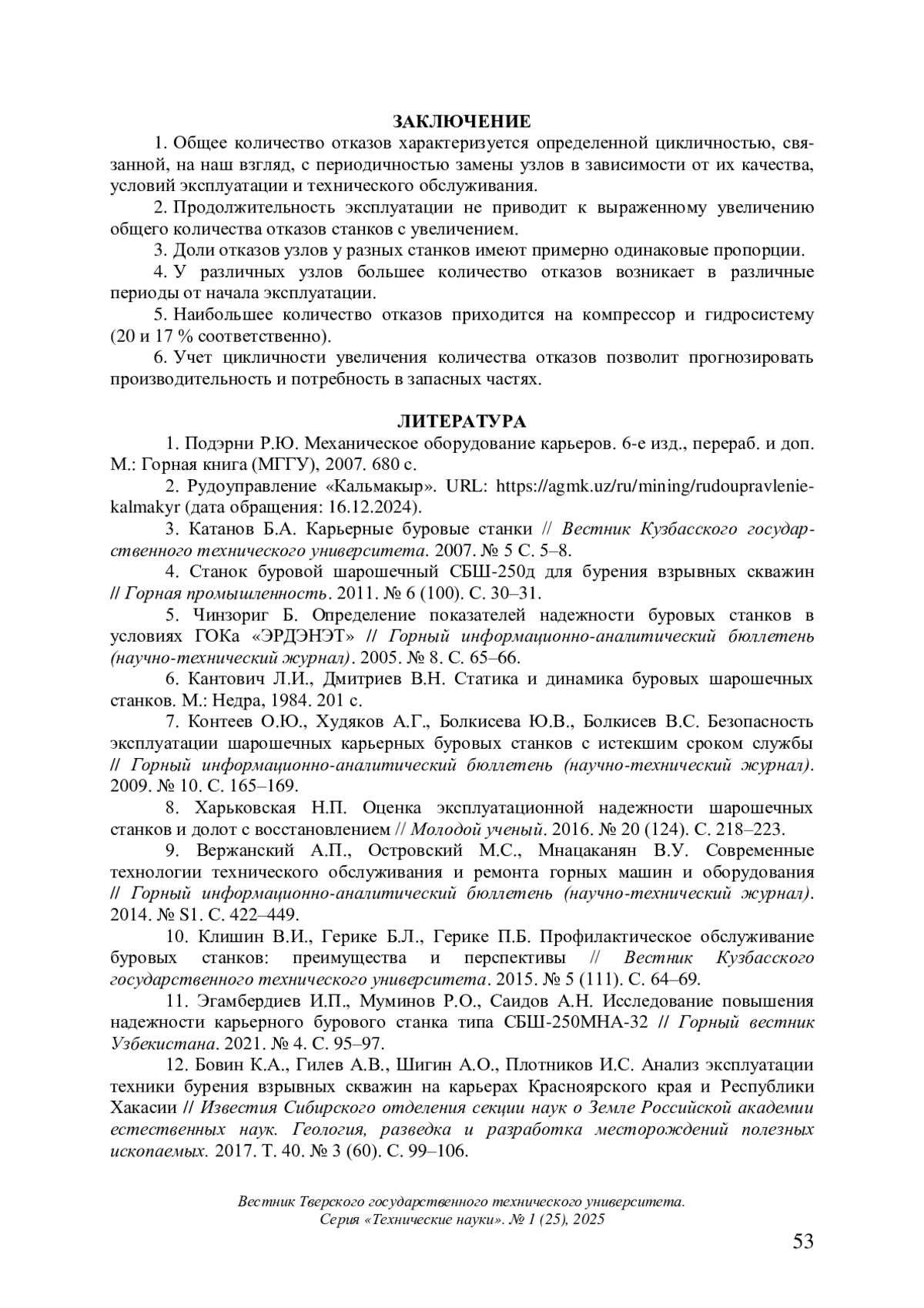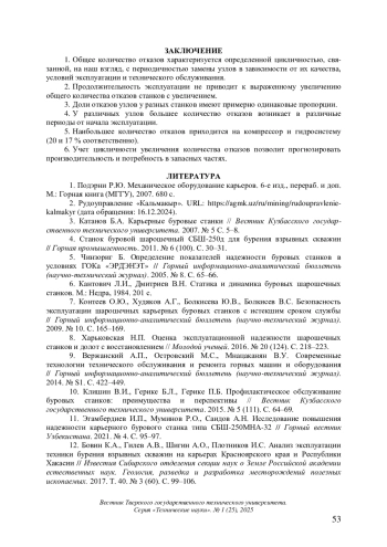 7. 	Контеев О.Ю., Худяков А.Г., Болкисева Ю.В., Болкисев В.С. Безопасность эксплуатации шарошечных карьерных буровых станков с истекшим сроком службы // Горный информационно-аналитический бюллетень (научно-технический журнал). 2009. № 10. С. 165-169.