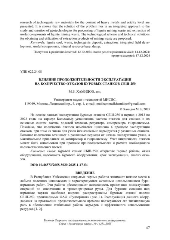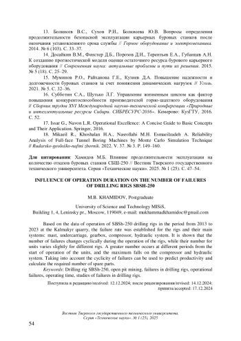 15. 	Муминов Р.О., Райханова Г.Е., Кузиев Д.А. Повышение надежности и долговечности буровых станков за счет понижения динамических нагрузок // Уголь. 2021. № 5. С. 32-36.  EDN: YYZUYB