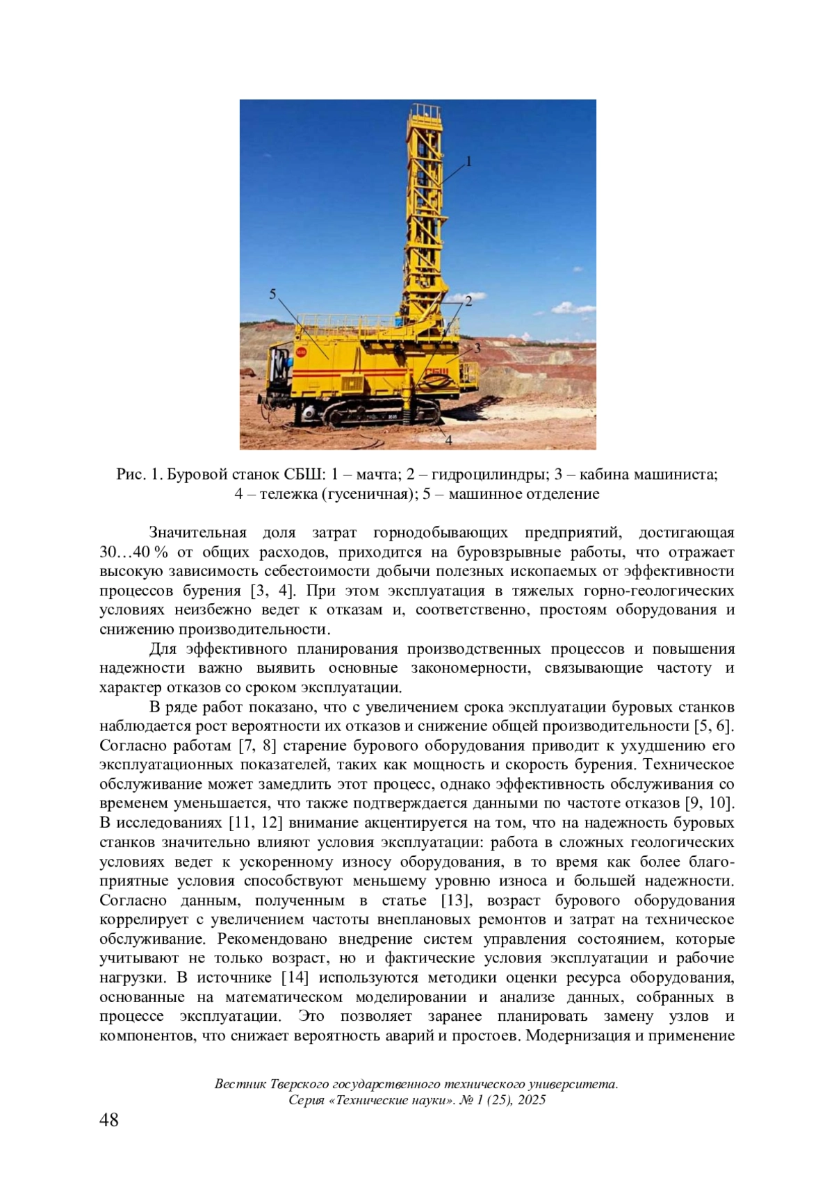 На основе данных эксплуатации буровых станков СБШ-250 в период с 2013 по 2023 годы на карьере Кальмакыр установлена частота отказов для станков и их основных систем: мачты, ходовой тележки, редуктора, компрессора, гидросистемы. Показано, что количество отказов изменяется циклично в процессе эксплуатации станков, при этом их число для узлов незначительно варьируется у различных станков. Большее количество возникает в различные периоды от начала эксплуатации узлов, а максимальное приходится на компрессор и гидросистему. Учет цикличности отказов может быть использован при прогнозе производительности и расчете необходимого количества запасных частей
