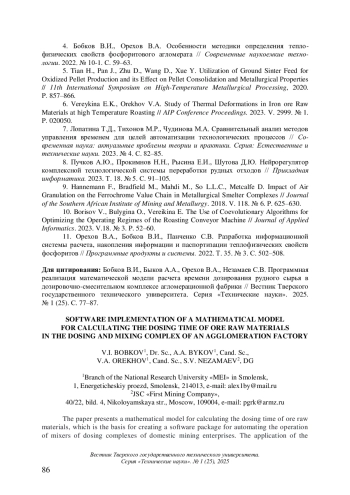 11. 	Орехов В.А., Бобков В.И., Панченко С.В. Разработка информационной системы расчета, накопления информации и паспортизации теплофизических свойств фосфоритов // Программные продукты и системы. 2022. Т. 35. № 3. С. 502-508.