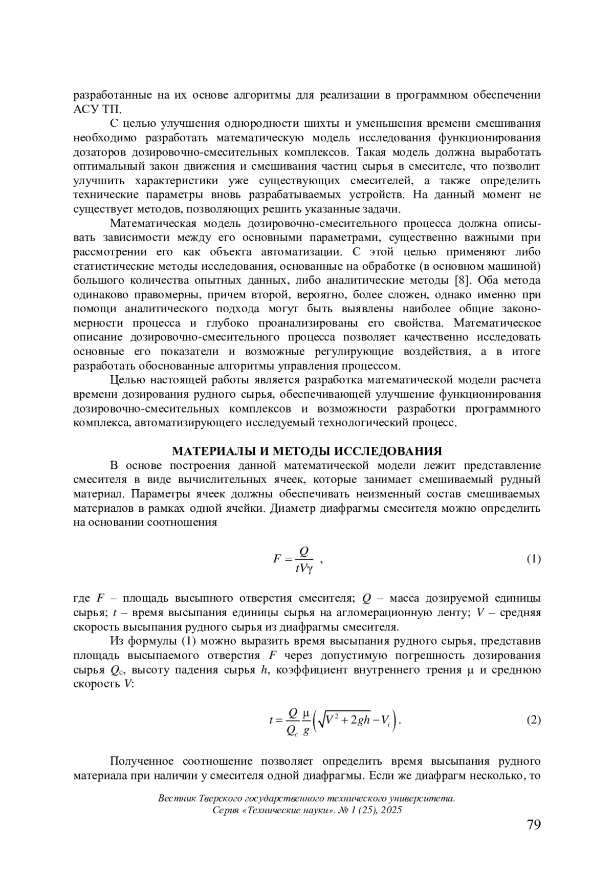 В статье представлена математическая модель расчета времени дозирования рудного сырья как основа создания программного комплекса автоматизации работы смесителей дозировочных комплексов отечественных горнорудных предприятий. Применение разработанной модели дает возможность проектировать современные дозировочно-смесительные комплексы для получения необходимого качества рудного сырья при минимальном времени смешивания, что существенно снижает простой технологического оборудования и тем самым повышает энергоэффективность агломерационных фабрик. Отмечено, что представление формы смесителя в виде ячеистой структуры позволило обеспечить неизменность состава рудного материала в процессе смешивания и при этом определить оптимальный закон движения его частиц. При использовании разработанного программного комплекса брак в составе шихты снизился на 11 %, скорость ссыпания сырья увеличилась на 17,4 %, а время общего простоя оборудования сократилось в 1,37 раза