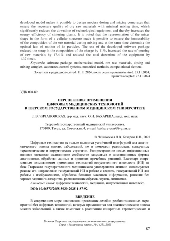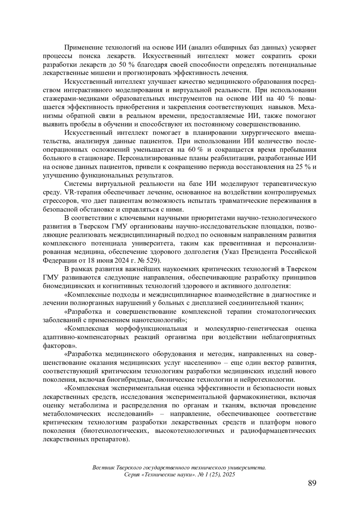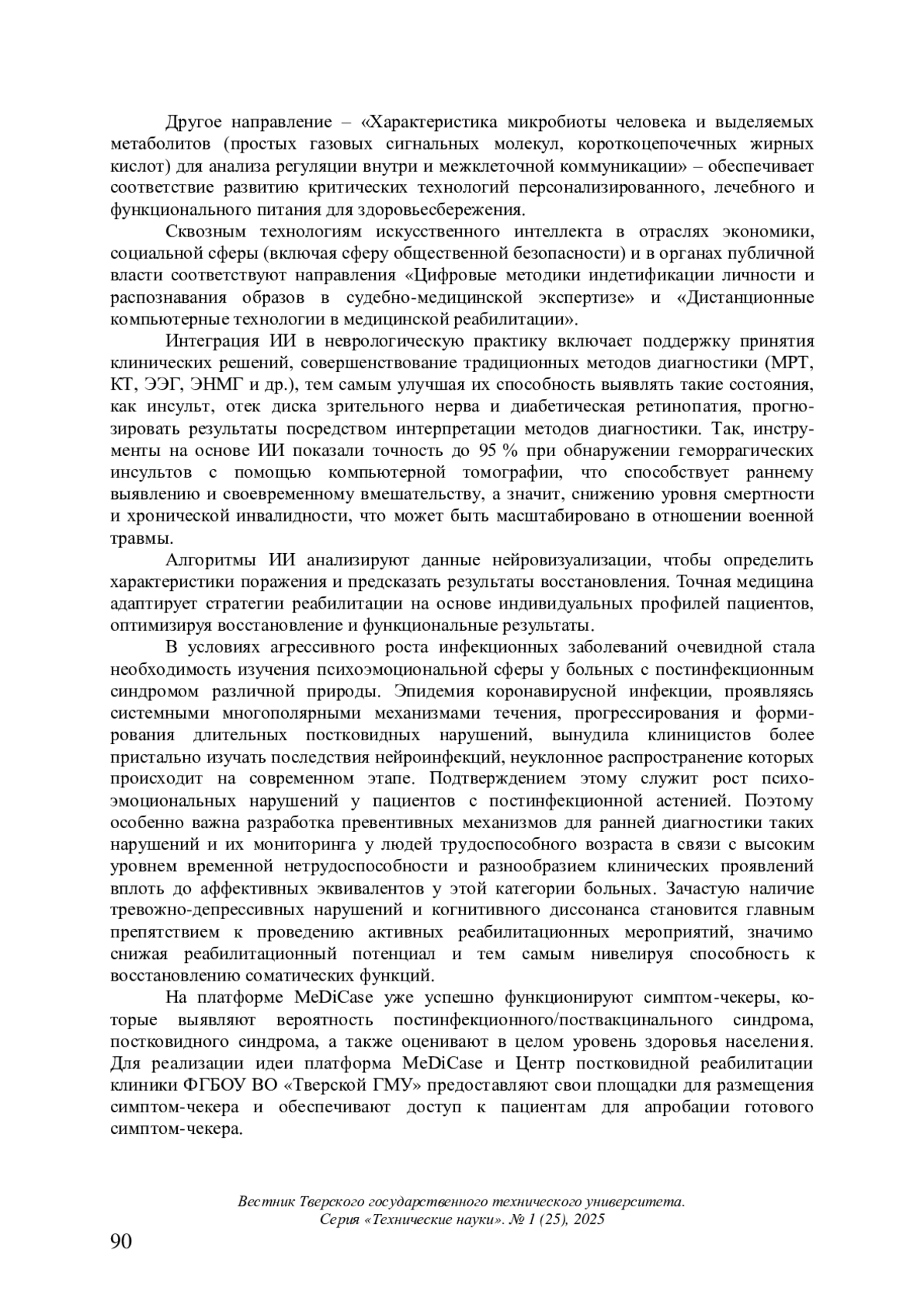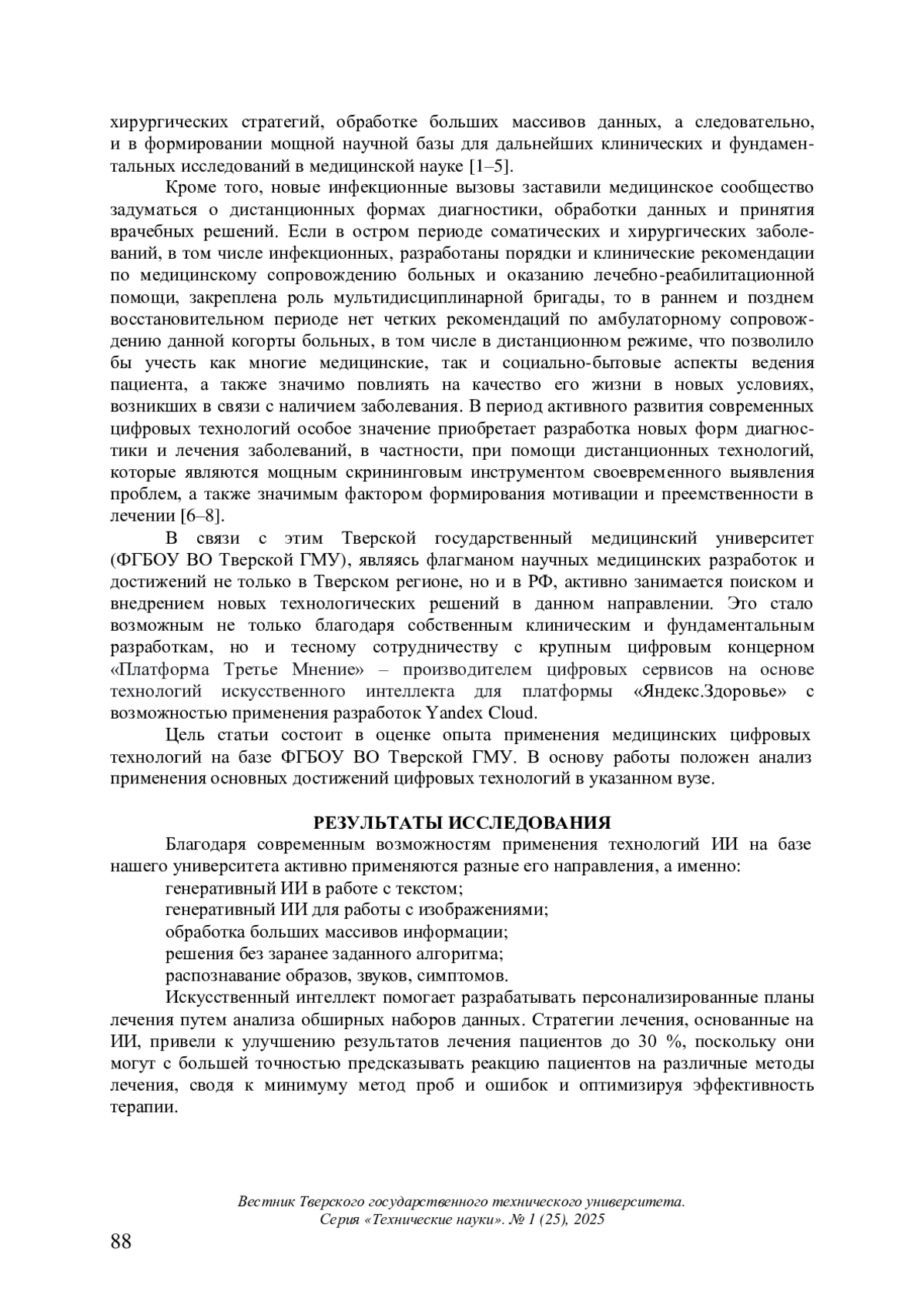 Цифровые технологии не только являются устойчивой платформой для диагностического поиска многих заболеваний, но и помогают реализовать конкретные терапевтические и хирургические стратегии. Распространение новых инфекционных вызовов заставило медицинское сообщество задуматься о дистанционных формах диагностики, обработки данных и принятия врачебных решений. Благодаря современным возможностям применения технологий искусственного интеллекта (ИИ) на базе Тверского государственного медицинского университета активно используются разные его направления: генеративный ИИ в работе с текстом, генеративный ИИ для работы с изображениями, обработка больших массивов информации, решения без заранее заданного алгоритма, распознавание образов, звуков, симптомов
