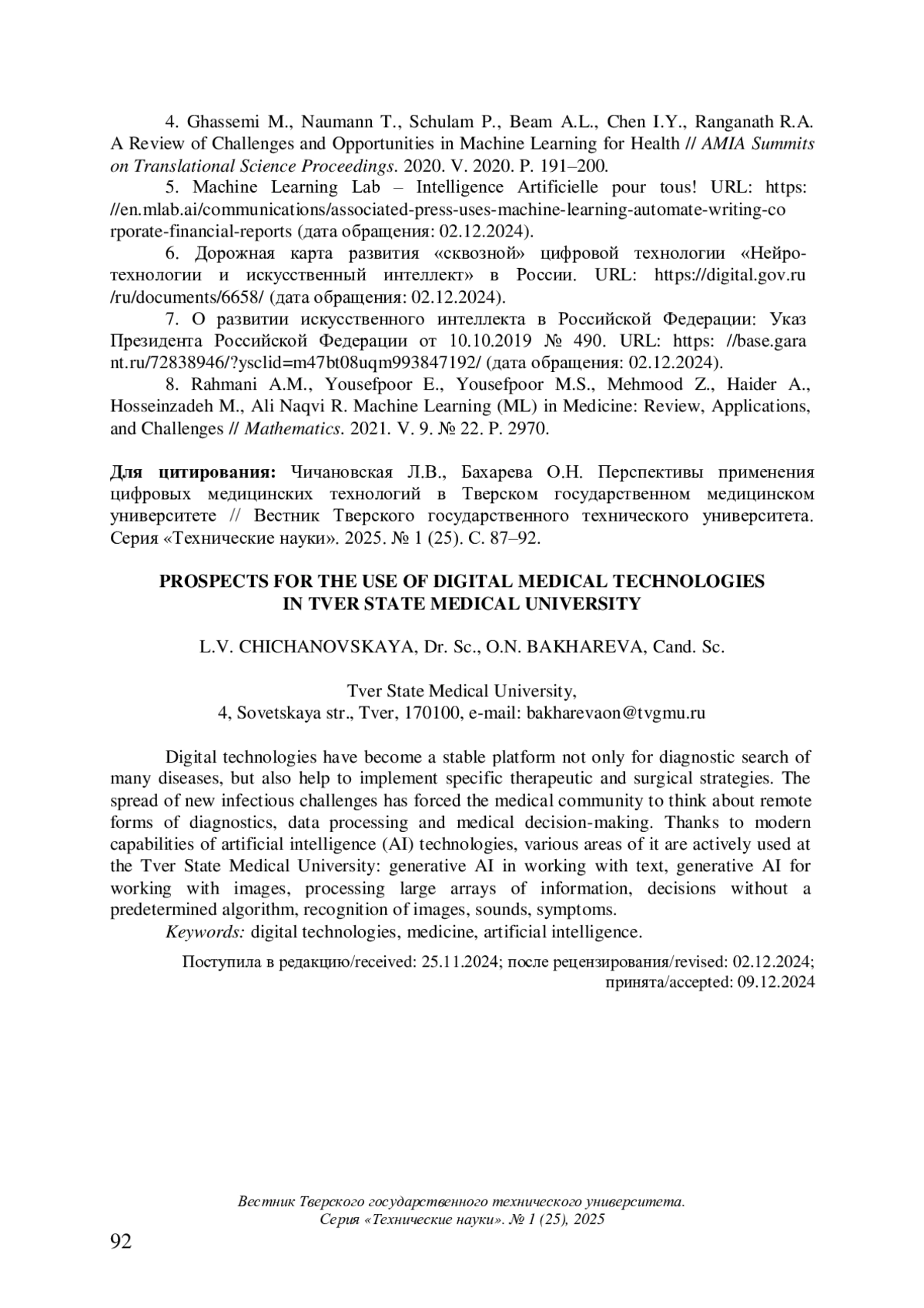 4. 	Ghassemi M., Naumann T., Schulam P., Beam A.L., Chen I.Y., Ranganath R.A. A Review of Challenges and Opportunities in Machine Learning for Health // AMIA Summits on Translational Science Proceedings. 2020. V. 2020. P. 191-200.