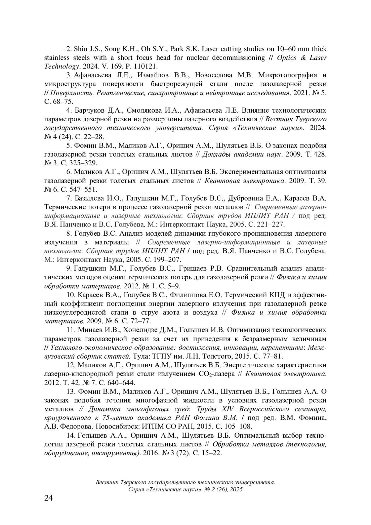 4. 	Барчуков Д.А., Смолякова И.А., Афанасьева Л.Е. Влияние технологических параметров лазерной резки на размер зоны лазерного воздействия // Вестник Тверского государственного технического университета. Серия “Технические науки”. 2024. № 4 (24). С. 22-28.  EDN: GPJLBT