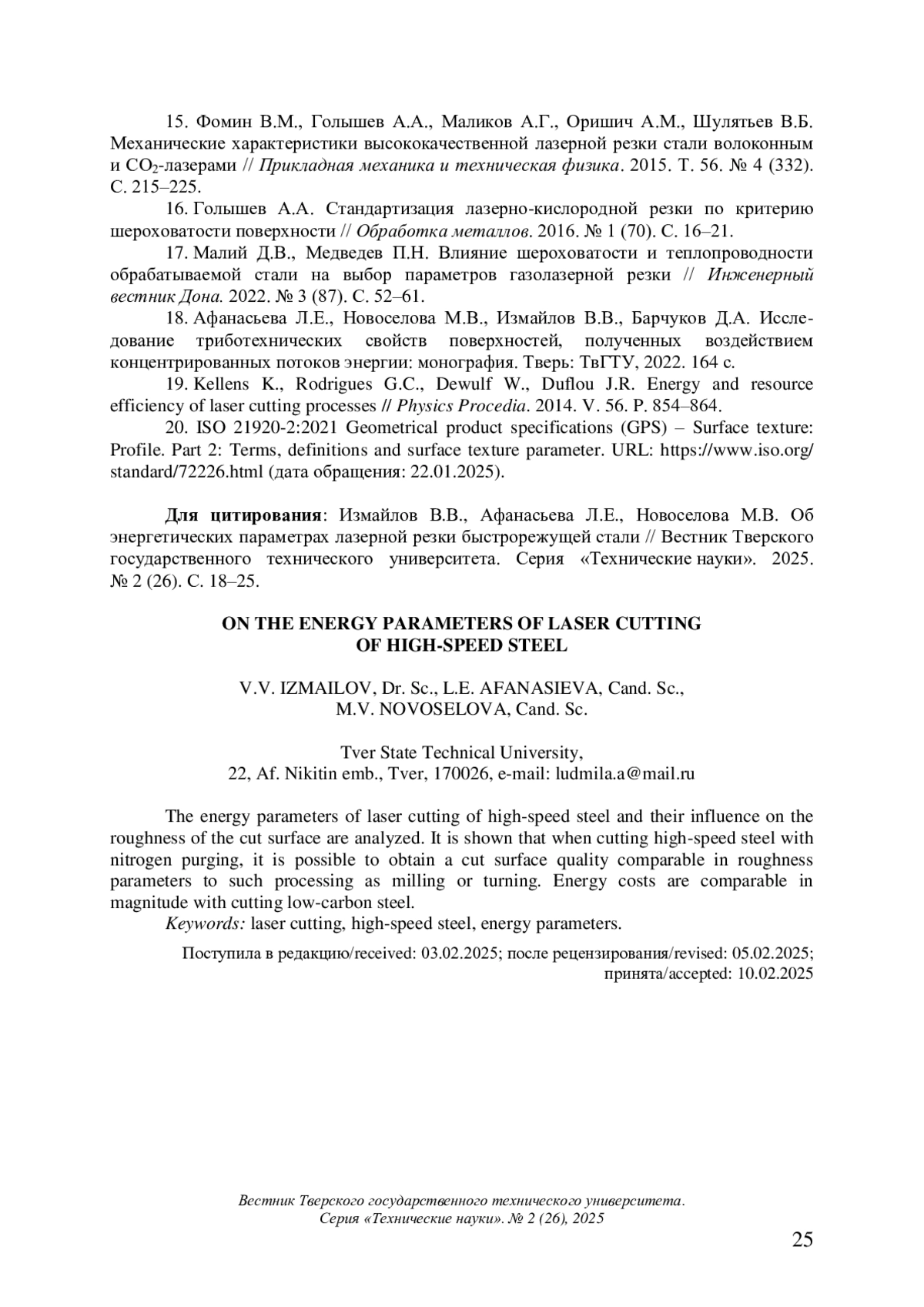 3. 	Афанасьева Л.Е., Измайлов В.В., Новоселова М.В. Микротопография и микроструктура поверхности быстрорежущей стали после газолазерной резки // Поверхность. Рентгеновские, синхротронные и нейтронные исследования. 2021. № 5. С. 68-75.