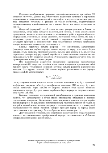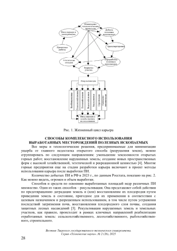 Указано, что открытый способ добычи полезных ископаемых предполагает большие нарушения поверхности земли, а, следовательно, наличие выработанных карьеров после окончания добычи. Отмечено, что поскольку площади этих карьеров весьма значительны, существует проблема по возвращению их в хозяйственную деятельность, которая решается различными путями, в том числе рекультивацией. Перечислены традиционные направления вовлечения выработанных карьеров в хозяйственный оборот (создание сельскохозяйственных угодий, строительство, лесонасаждения, создание прудов, парков, зон отдыха). Сделан вывод: поскольку выработанные торфяные месторождения обладают ярко выраженной спецификой, ограничивающей их введение в хозяйственную деятельность, для них самым актуальным комплексным использованием является создание прудов с последующим зарыблением.