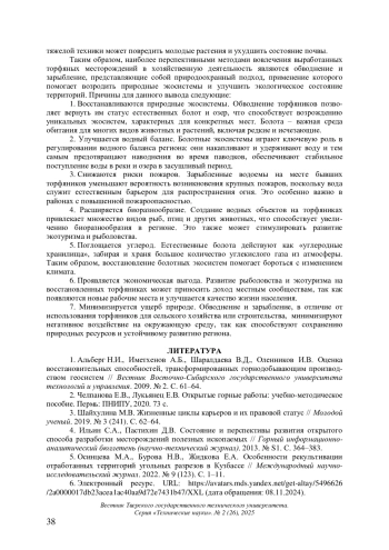 1. 	Альберг Н.И., Иметхенов А.Б., Шаралдаева В.Д., Оленников И.В. Оценка восстановительных способностей, трансформированных горнодобывающим производством геосистем // Вестник Восточно-Сибирского государственного университета технологий и управления. 2009. № 2. С. 61-64.