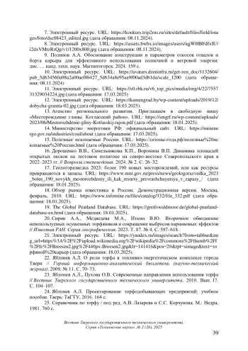 9. 	Полинов А.А. Обоснование конструкции и параметров откосов отвалов и борта карьера для эффективного использования солнечной и ветровой энергии: дис. … канд. техн. наук. Магнитогорск. 2024. 159 с.  EDN: KCSSWA