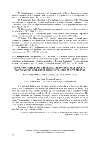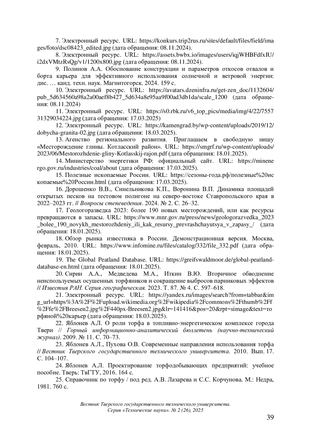 23. 	Яблонев А.Л., Пухова О.В. Современные направления использования торфа // Вестник Тверского государственного технического университета. 2010. Вып. 17. С. 104-107.  EDN: TEVUIH