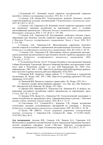 5. 	Селюков А.В., Герасимов А.В. Регулирование дисбаланса объемов отвало-образования при блоковом способе отработки карьерных полей угольных разрезов // Известия Тульского государственного университета. Науки о Земле. 2024. № 3. С. 313-328.  EDN: IZJGWD