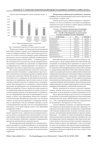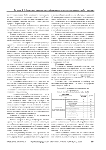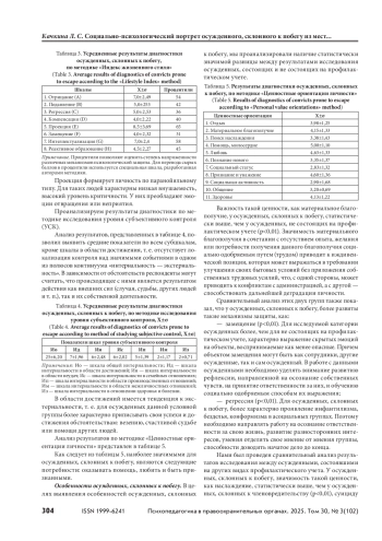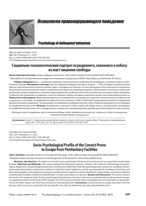 Цель — выявление социально-психологических особенностей осужденных, склонных к побегу из мест лишения свободы. Материалы и методы. Для исследования выбраны: методика «Акцент — 2-90»; методика психологической диагностики механизмов психологических защит; психодиагностическая система Келлермана-Плутчика для исследования механизмов психологических защит осужденных; методика исследования уровня субъективного контроля; анкета для выявления уголовно-правовых и социально-демографических особенностей личности; анкета для экспертов в целях выявления особенностей поведения осужденных в местах лишения свобод; методика выявления ценностных ориентаций личности. Результаты и обсуждение. Представлены результаты эмпирического исследования социально-психологических особенностей осужденных, состоящих на профилактическом учете как склонные к побегу. Проведен сравнительный анализ исследования данной категории осужденных с осужденными, состоявшими на профилактическом учете по другим причинам и не состоявшими на профилактическом учете. Выводы. Осужденные, склонные к побегу, имеют как общие черты с осужденными, состоящими на профилактическом учете, так и специфические, которые могут детерминировать данный вид пенитенциарного преступления.