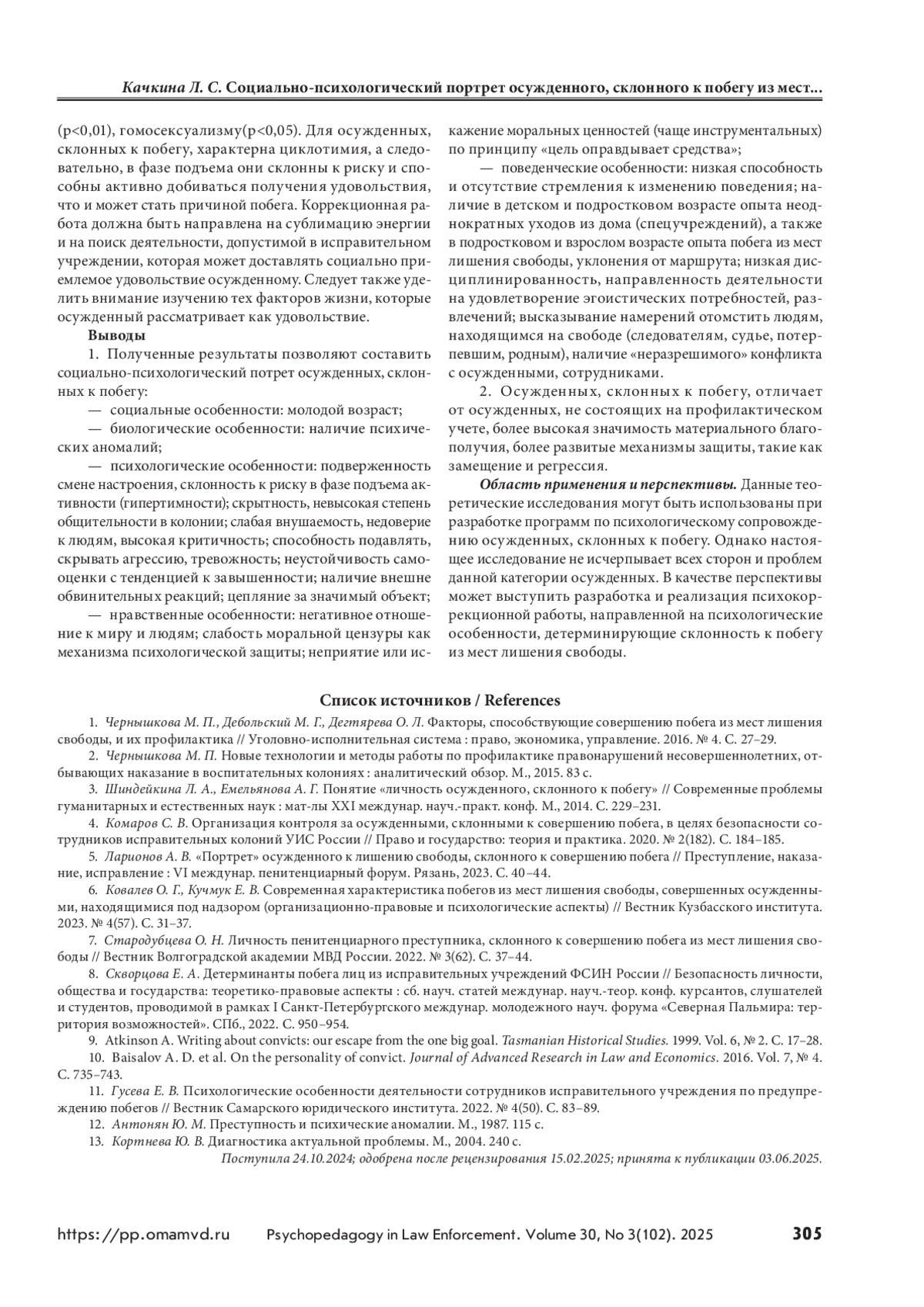 6. Ковалев О. Г., Кучмук Е. В. Современная характеристика побегов из мест лишения свободы, совершенных осужденными, находящимися под надзором (организационно-правовые и психологические аспекты) // Вестник Кузбасского института. 2023. № 4(57). С. 31–37.