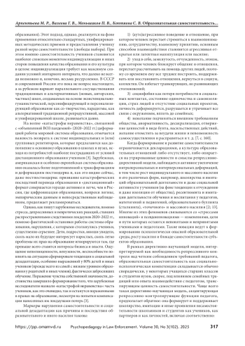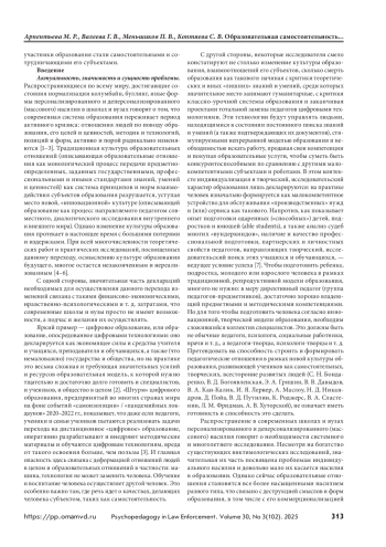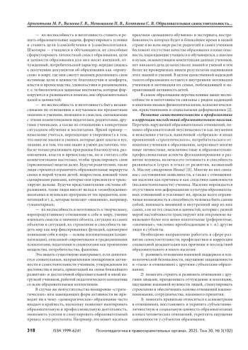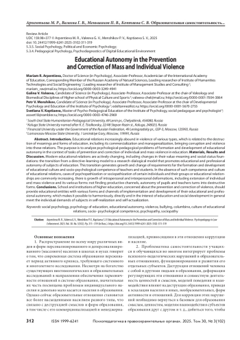 Распространение по всему миру колумбайна, буллинга, иных форм персонализированного и деперсонализированного (массового) насилия в школах и вузах говорит о том, что современная система образования переживает период активного кризиса, требующего системного и многолетнего исследования. Образовательные отношения становятся все более насыщенными насилием разного типа, что связано с деструкцией смыслов и форм образования, в том числе с его коммерционализацией и менеджериализацией, привносящими в эти отношения коррупцию и насилие. Цель — анализ психолого-педагогических проблем формирования и развития образовательной самостоятельности в контексте задач профилактики и коррекции индивидуального и массового насилия в образовании. Материалы, результаты и обсуждение. Современные образовательные отношения активно изменяются, включая изменения их ценностно-смысловых и социальностатусных основ: переход от директивно-научающей модели к модели исследовательски-диалогической, поощряющей образовательную и профессиональную самостоятельность субъектов образования. Этот переход порождает рост и изменение требований к формированию и развитию образовательной культуры и социально-психологической компетентности педагогов и учеников. При отсутствии такой компетентности и культуры образовательных отношений все более распространенными становятся случаи психопатизации или социопатизации отдельных индивидов и их групп или образовательных отношений, увеличение интраперсональных и интерперсональных деформаций, в том числе рост индивидуального и массового насилия и его различных форм: не найдя продуктивных каналов, самостоятельность учеников и педагогов выливается в деструктивные формы. Выводы. Школа и вуз, заинтересованные в профилактике и коррекции насилия, должны предоставлять субъектам образования разнообразные формы и каналы осуществления и развития их образовательной и профессиональной самостоятельности, позволяющей гармонично, прямо и в интересах образования и общественного развития в целом удовлетворить индивидуальные запросы субъектов в самореализации и самоактуализации.
