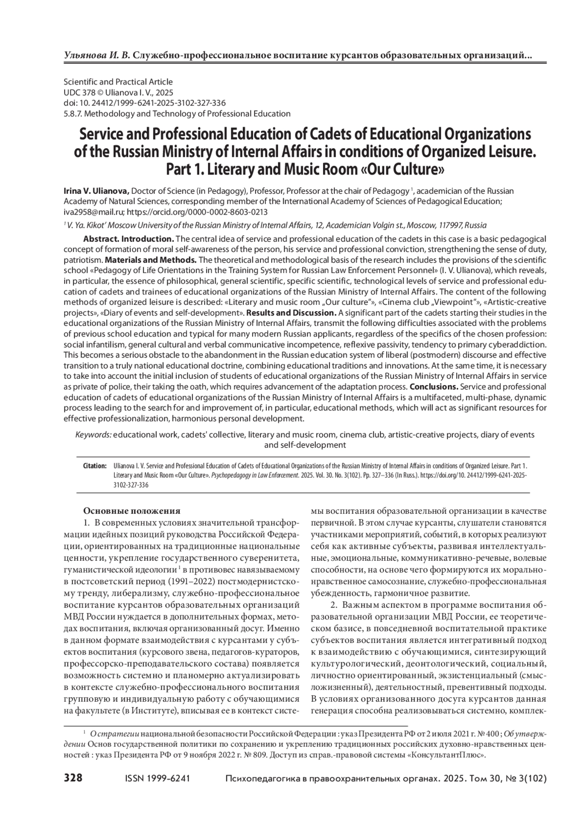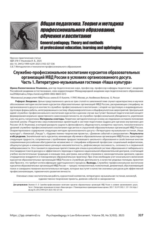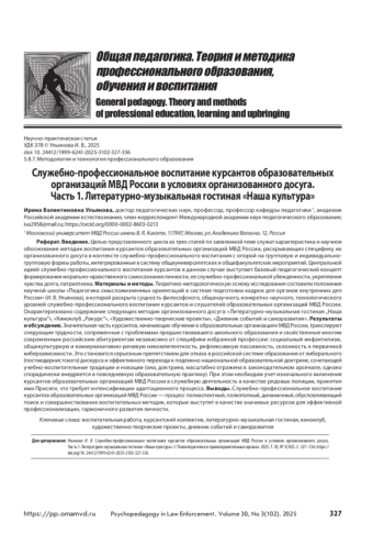 Целью представленного цикла из трех статей по заявленной теме служат характеристика и научное обоснование методик воспитания курсантов образовательных организаций МВД России, раскрывающих специфику их организованного досуга в контексте служебно-профессионального воспитания с опорой на групповую и индивидуальногрупповую формы работы, интегрированные в систему общеуниверситетских и общефакультетских мероприятий. Центральной идеей служебно-профессионального воспитания курсантов в данном случае выступает базовый педагогический концепт формирования морально-нравственного самосознания личности, ее служебно-профессиональной убежденности, укрепления чувства долга, патриотизма. Материалы и методы. Теоретико-методологическую основу исследования составили положения научной школы «Педагогика смысложизненных ориентаций в системе подготовки кадров для органов внутренних дел России» (И. В. Ульянова), в которой раскрыта сущность философского, общенаучного, конкретно-научного, технологического уровней служебно-профессионального воспитания курсантов и слушателей образовательных организаций МВД России. Охарактеризовано содержание следующих методик организованного досуга: «Литературно-музыкальная гостиная „Наша культура“», «Киноклуб „Ракурс“», «Художественно-творческие проекты», «Дневник событий и саморазвития». Результаты и обсуждение. Значительная часть курсантов, начинающих обучение в образовательных организациях МВД России, транслируют следующие трудности, сопряженные с проблемами предшествовавшего школьного образования и свойственные многим современным российским абитуриентам независимо от специфики избранной профессии: социальный инфантилизм, общекультурную и коммуникативно-речевую некомпетентность, рефлексивную пассивность, склонность к первичной киберзависимости. Это становится серьезным препятствием для отказа в российской системе образования от либерального (постмодернистского) дискурса и эффективного перехода к подлинно национальной образовательной доктрине, сочетающей учебно-воспитательные традиции и новации (она, доктрина, масштабно отражена в законодательном арсенале, однако спорадически внедряется в повседневную образовательную практику). При этом необходим учет изначального включения курсантов образовательных организаций МВД России в служебную деятельность в качестве рядовых полиции, принятия ими Присяги, что требует интенсификации адаптационного процесса. Выводы. Служебно-профессиональное воспитание курсантов образовательных организаций МВД России — процесс полиаспектный, полиэтапный, динамичный, обусловливающий поиск и совершенствование воспитательных методик, которые выступят в качестве значимых ресурсов для эффективной профессионализации, гармоничного развития личности.