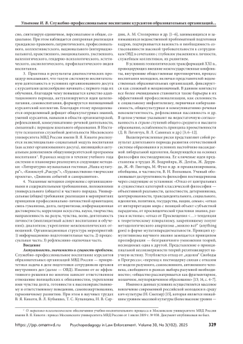 1. В современных условиях значительной трансформации идейных позиций руководства Российской Федерации, ориентированных на традиционные национальные ценности, укрепление государственного суверенитета, гуманистической идеологии 1 в противовес навязываемому в постсоветский период (1991–2022) постмодернистскому тренду, либерализму, служебно-профессиональное воспитание курсантов образовательных организаций МВД России нуждается в дополнительных формах, методах воспитания, включая организованный досуг. Именно в данном формате взаимодействия с курсантами у субъектов воспитания (курсового звена, педагогов-кураторов, профессорско-преподавательского состава) появляется возможность системно и планомерно актуализировать в контексте служебно-профессионального воспитания групповую и индивидуальную работу с обучающимися на факультете (в Институте), вписывая ее в контекст системы воспитания образовательной организации в качестве первичной. В этом случае курсанты, слушатели становятся участниками мероприятий, событий, в которых реализуют себя как активные субъекты, развивая интеллектуальные, эмоциональные, коммуникативно-речевые, волевые способности, на основе чего формируются их моральнонравственное самосознание, служебно-профессиональная убежденность, гармоничное развитие.
