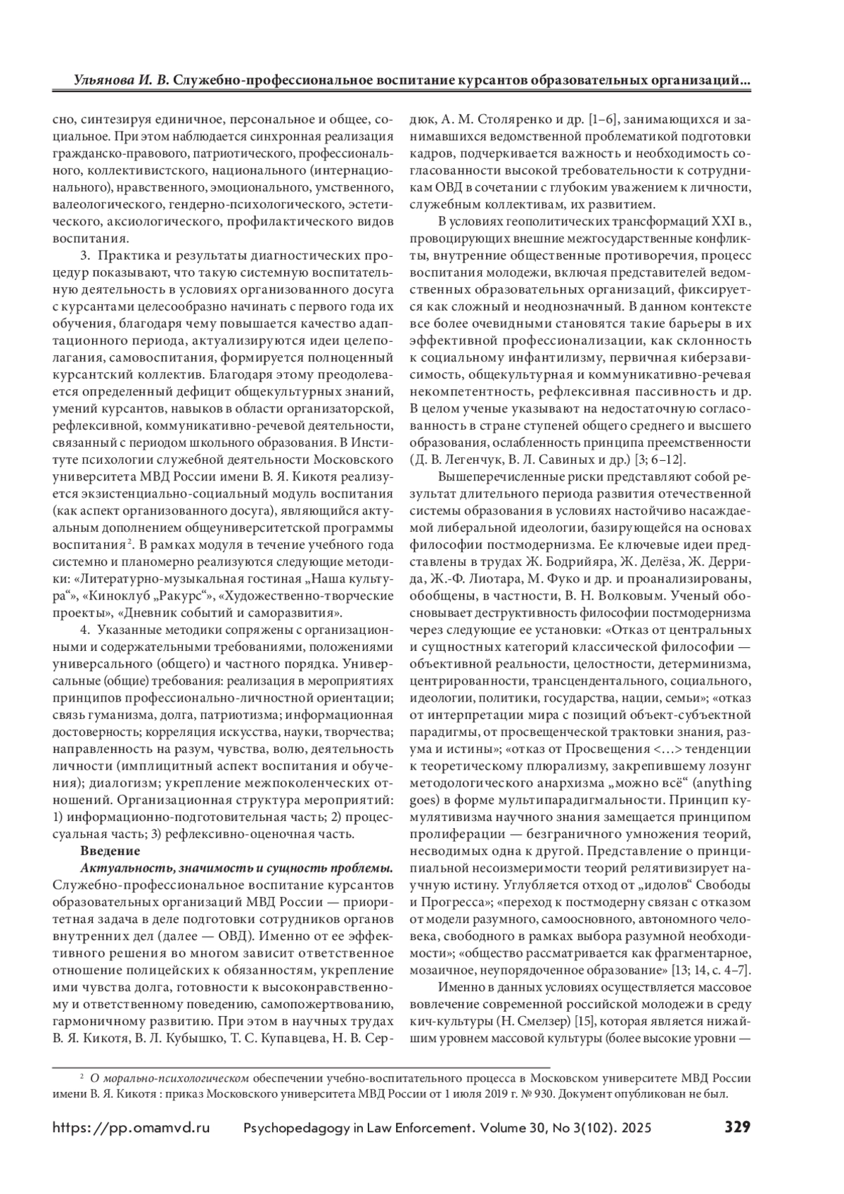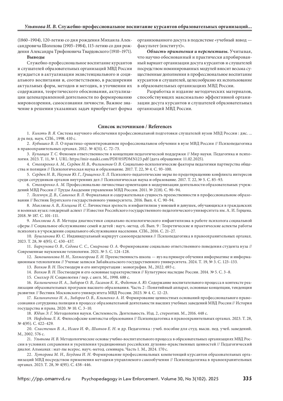 17. Калиниченко И. А., Зиборов О. В., Клименко А. И. Формирование ценностных оснований профессионального правосознания сотрудника полиции в процессе образовательной деятельности высших учебных заведений МВД России // История государства и права. 2020. № 10. С. 3–10.