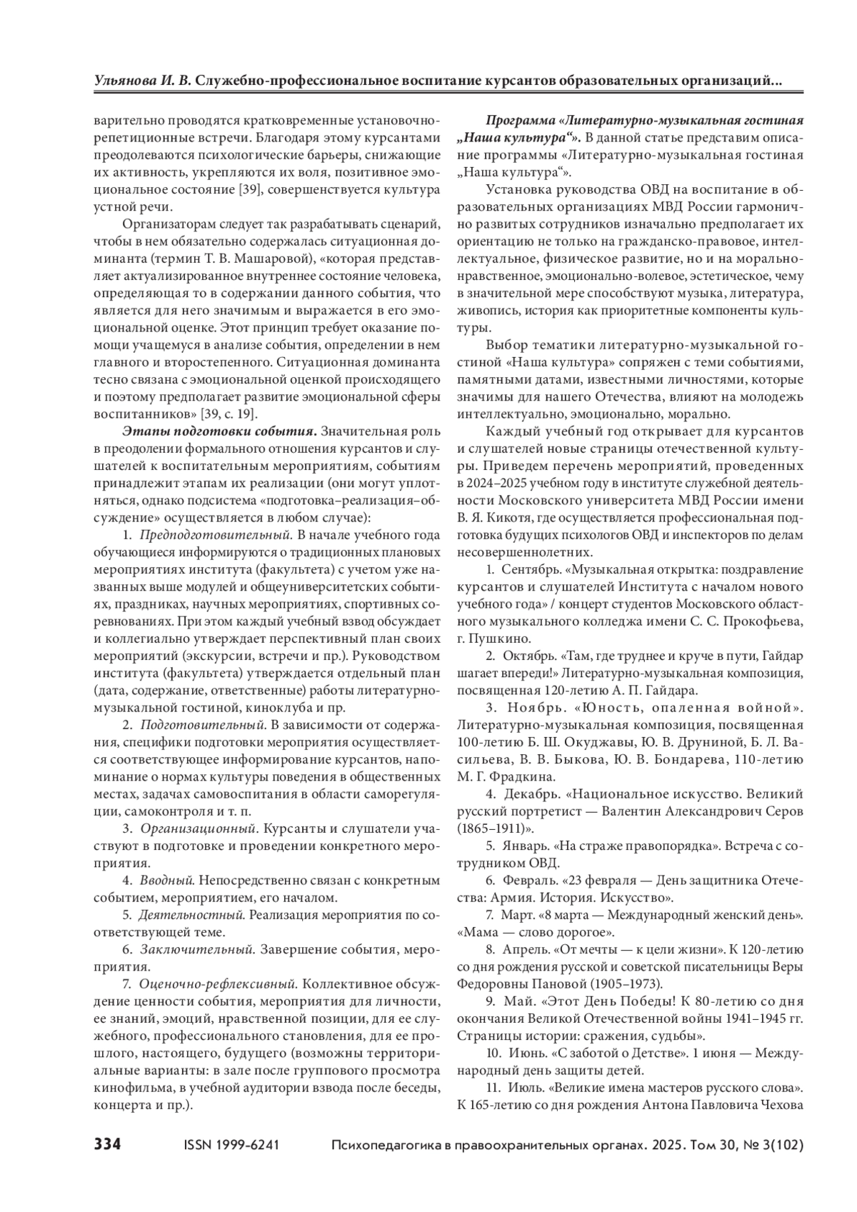 21. Ульянова И. В. Методологические основы учебно-воспитательного процесса в образовательных организациях МВД России в условиях сохранения и укрепления традиционных российских духовно-нравственных ценностей // Педагогический диалог. Альманах : мат-лы всерос. науч.-метод. семинара. Часть 1. М., 2024. 170 с.