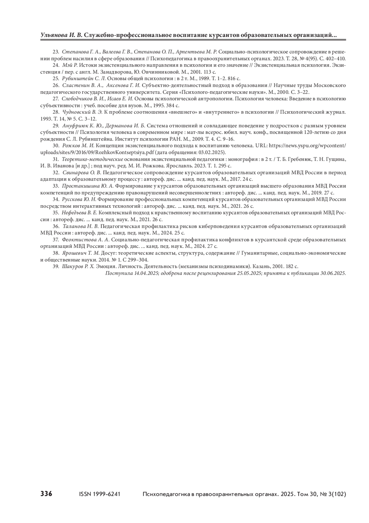 22. Хуторова М. Н., Блудова И. Н. Формирование профессиональных компетенций курсантов образовательных организаций МВД посредством применения методики управляемого самообучения // Психопедагогика в правоохранительных органах. 2023. Т. 28, № 4(95). С. 438–446.