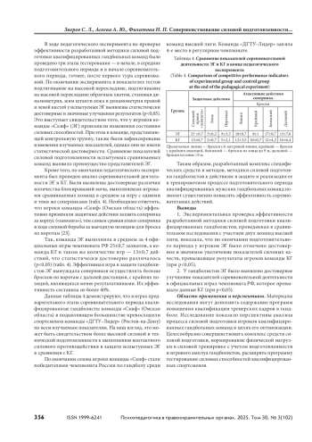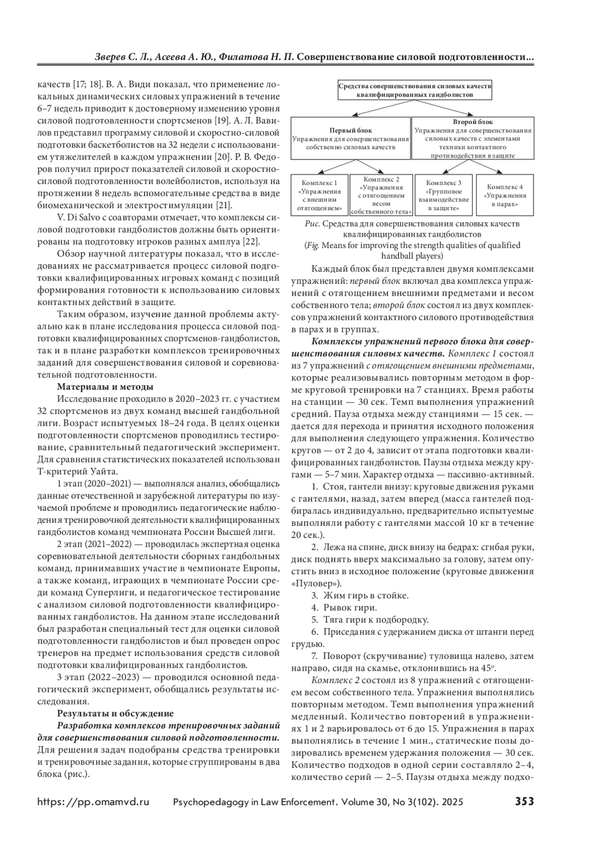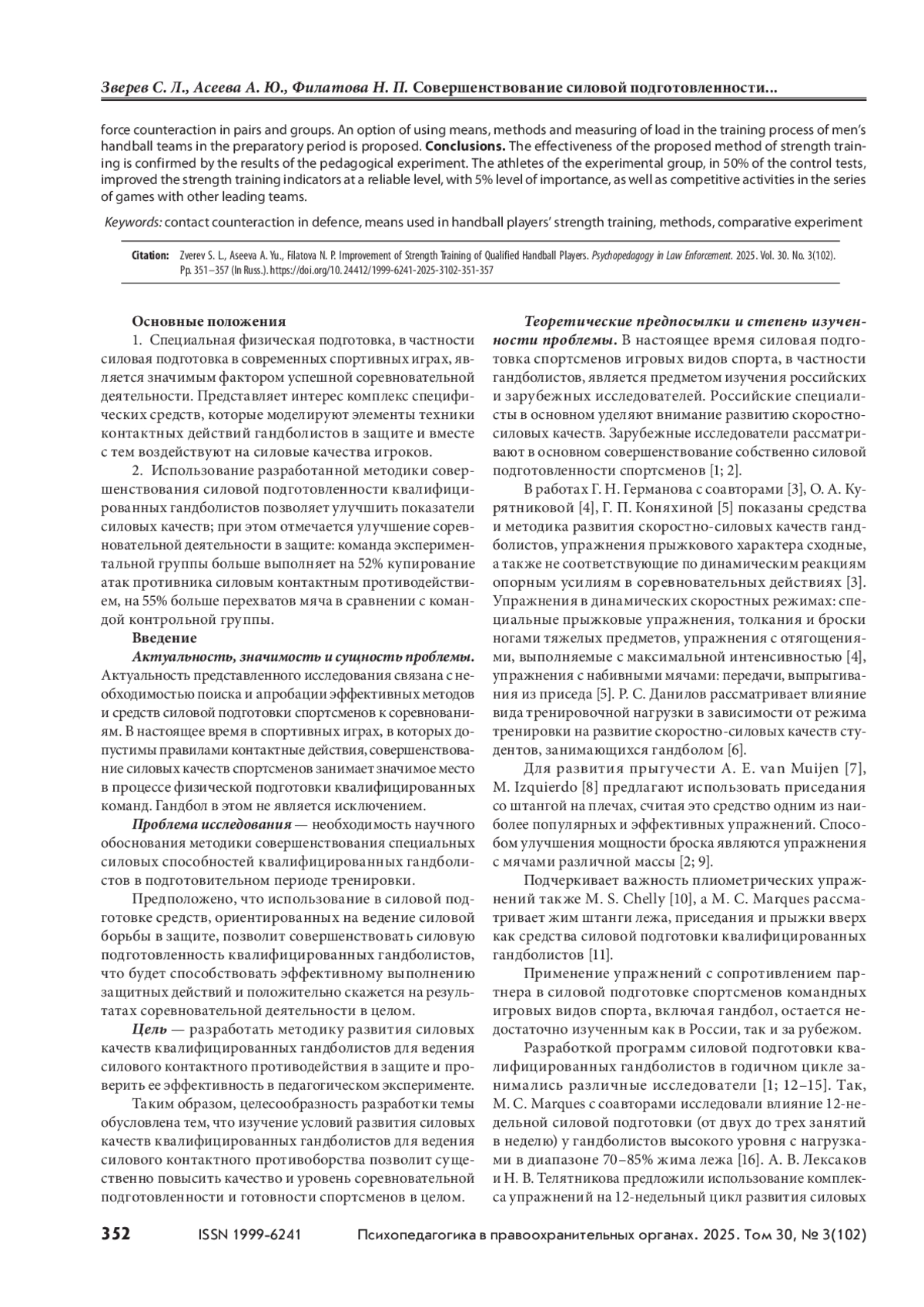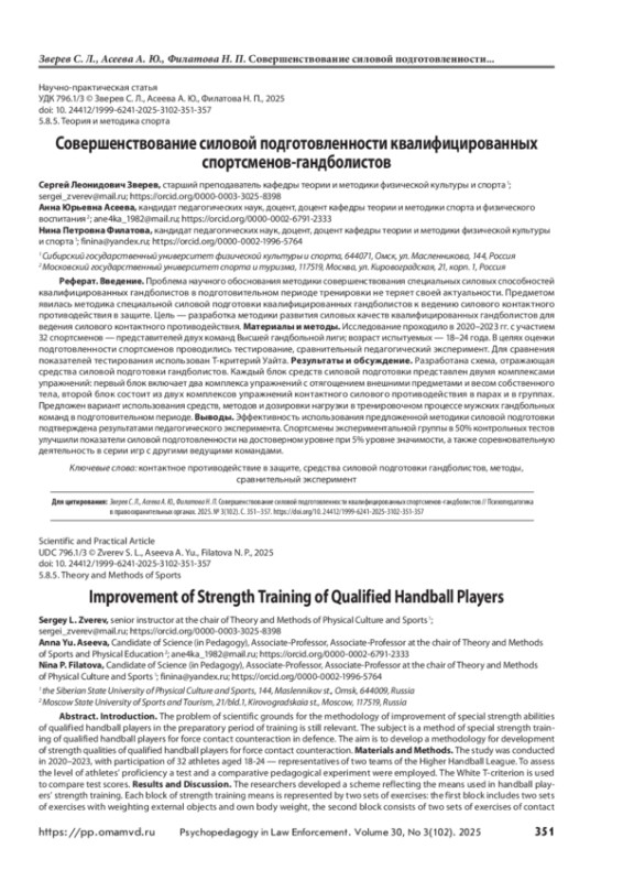 Проблема научного обоснования методики совершенствования специальных силовых способностей квалифицированных гандболистов в подготовительном периоде тренировки не теряет своей актуальности. Предметом явилась методика специальной силовой подготовки квалифицированных гандболистов к ведению силового контактного противодействия в защите. Цель — разработка методики развития силовых качеств квалифицированных гандболистов для ведения силового контактного противодействия. Материалы и методы. Исследование проходило в 2020–2023 гг. с участием 32 спортсменов — представителей двух команд Высшей гандбольной лиги; возраст испытуемых — 18–24 года. В целях оценки подготовленности спортсменов проводились тестирование, сравнительный педагогический эксперимент. Для сравнения показателей тестирования использован Т-критерий Уайта. Результаты и обсуждение. Разработана схема, отражающая средства силовой подготовки гандболистов. Каждый блок средств силовой подготовки представлен двумя комплексами упражнений: первый блок включает два комплекса упражнений с отягощением внешними предметами и весом собственного тела, второй блок состоит из двух комплексов упражнений контактного силового противодействия в парах и в группах. Предложен вариант использования средств, методов и дозировки нагрузки в тренировочном процессе мужских гандбольных команд в подготовительном периоде. Выводы. Эффективность использования предложенной методики силовой подготовки подтверждена результатами педагогического эксперимента. Спортсмены экспериментальной группы в 50% контрольных тестов улучшили показатели силовой подготовленности на достоверном уровне при 5% уровне значимости, а также соревновательную деятельность в серии игр с другими ведущими командами.