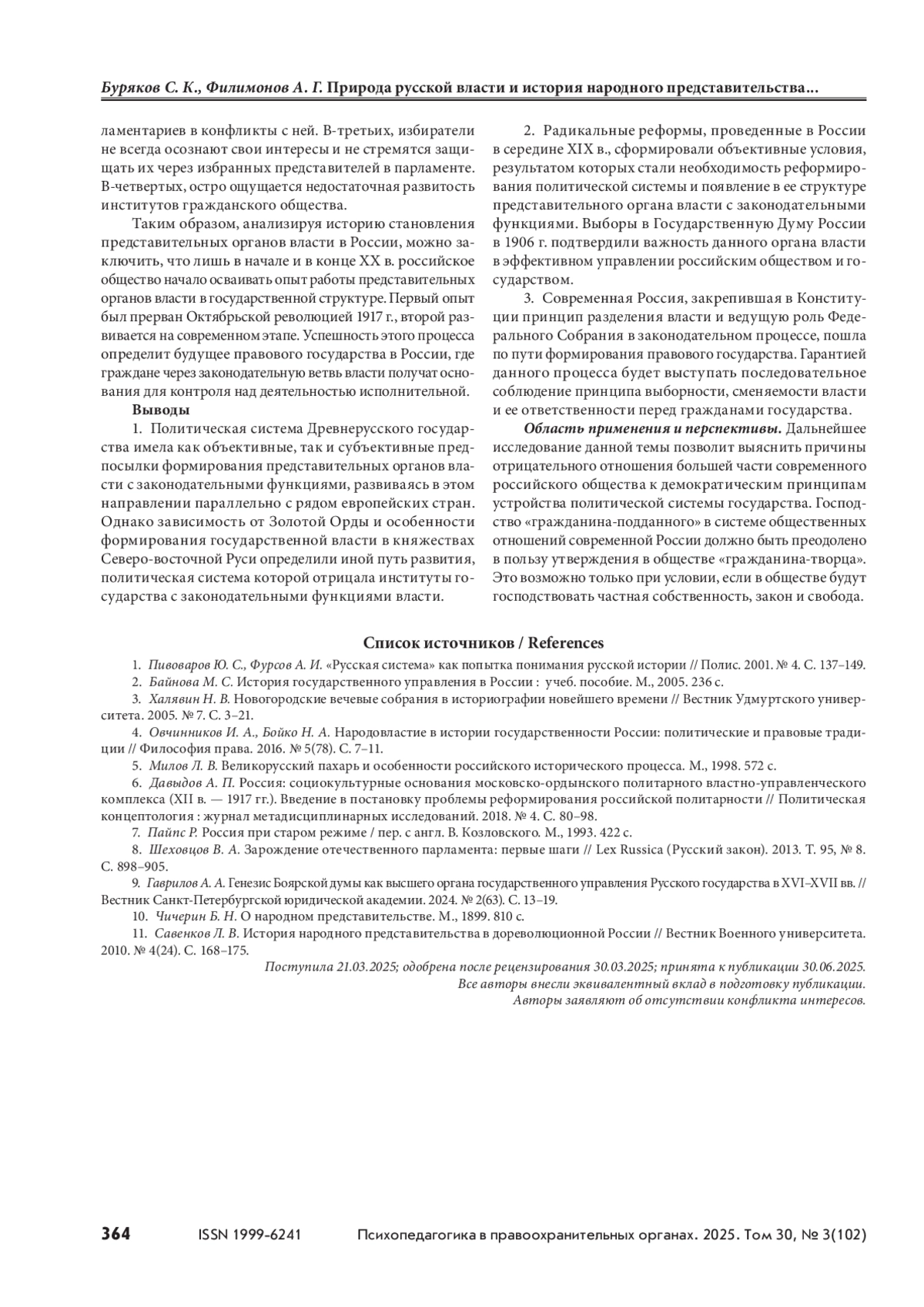 9. Гаврилов А. А. Генезис Боярской думы как высшего органа государственного управления Русского государства в XVI–XVII вв. // Вестник Санкт-Петербургской юридической академии. 2024. № 2(63). С. 13–19.