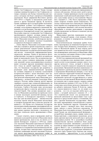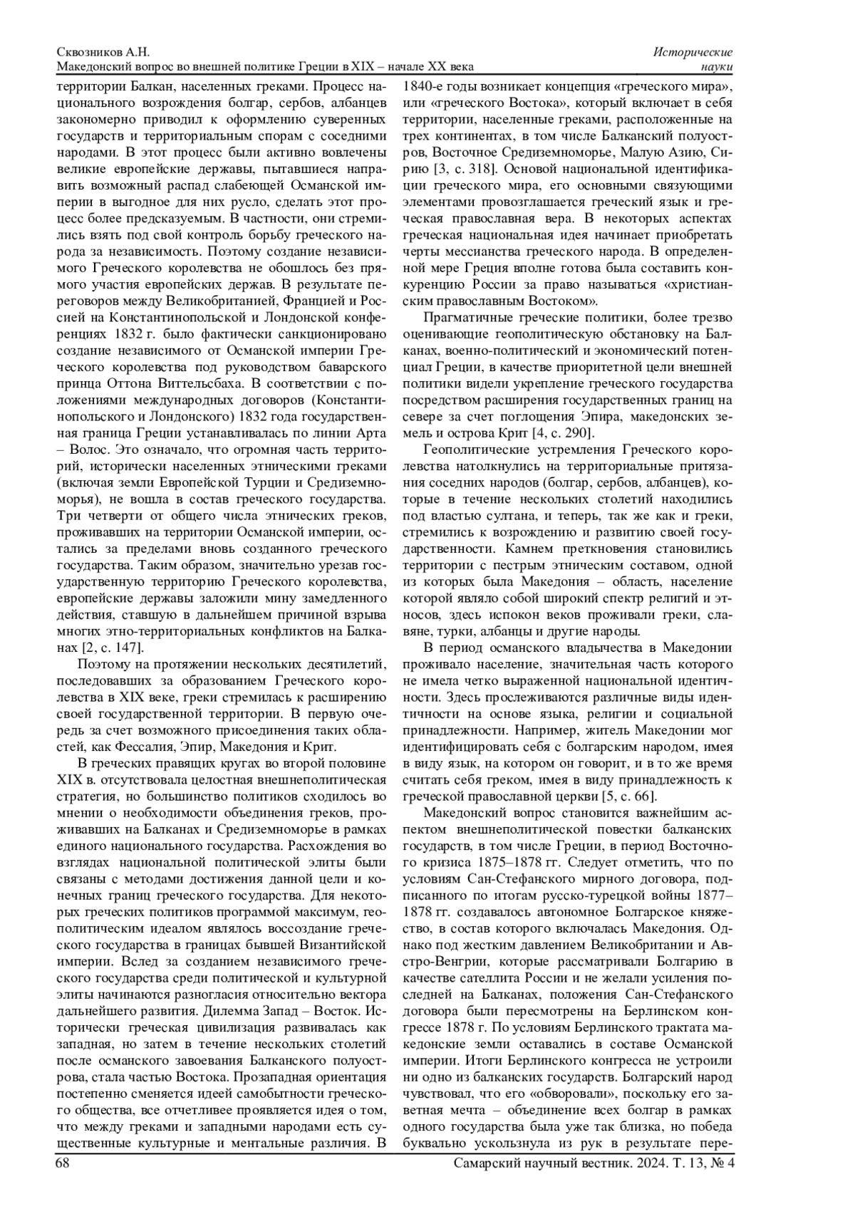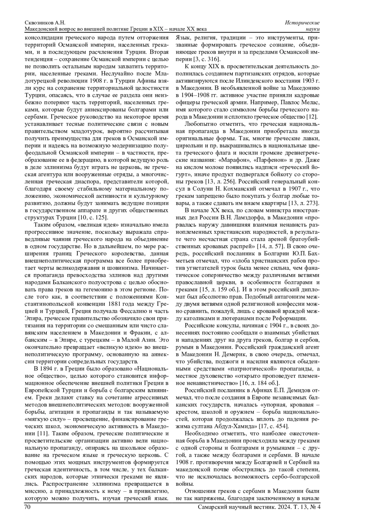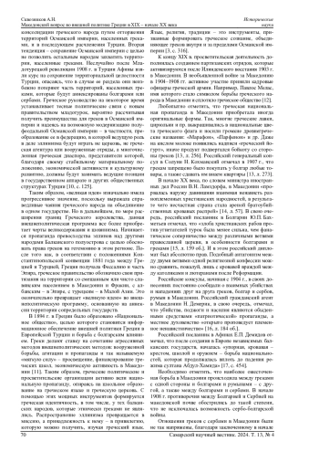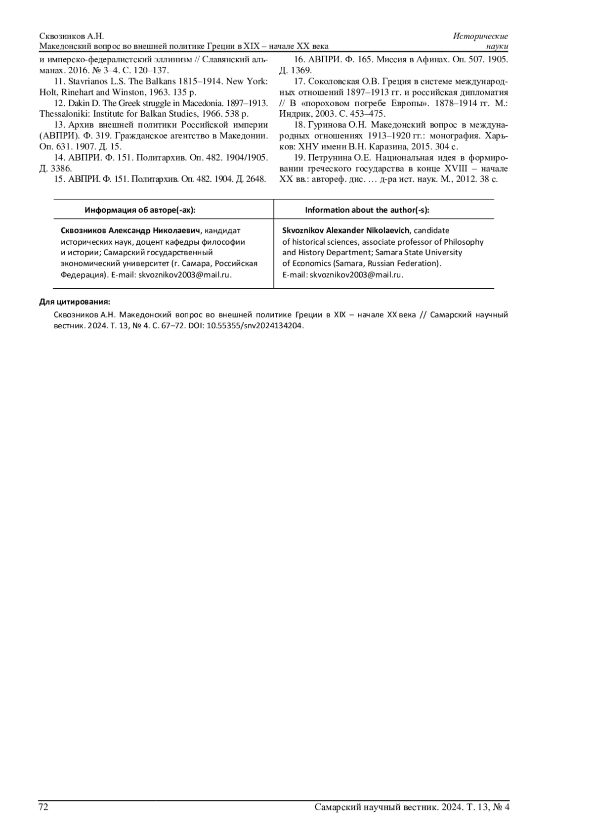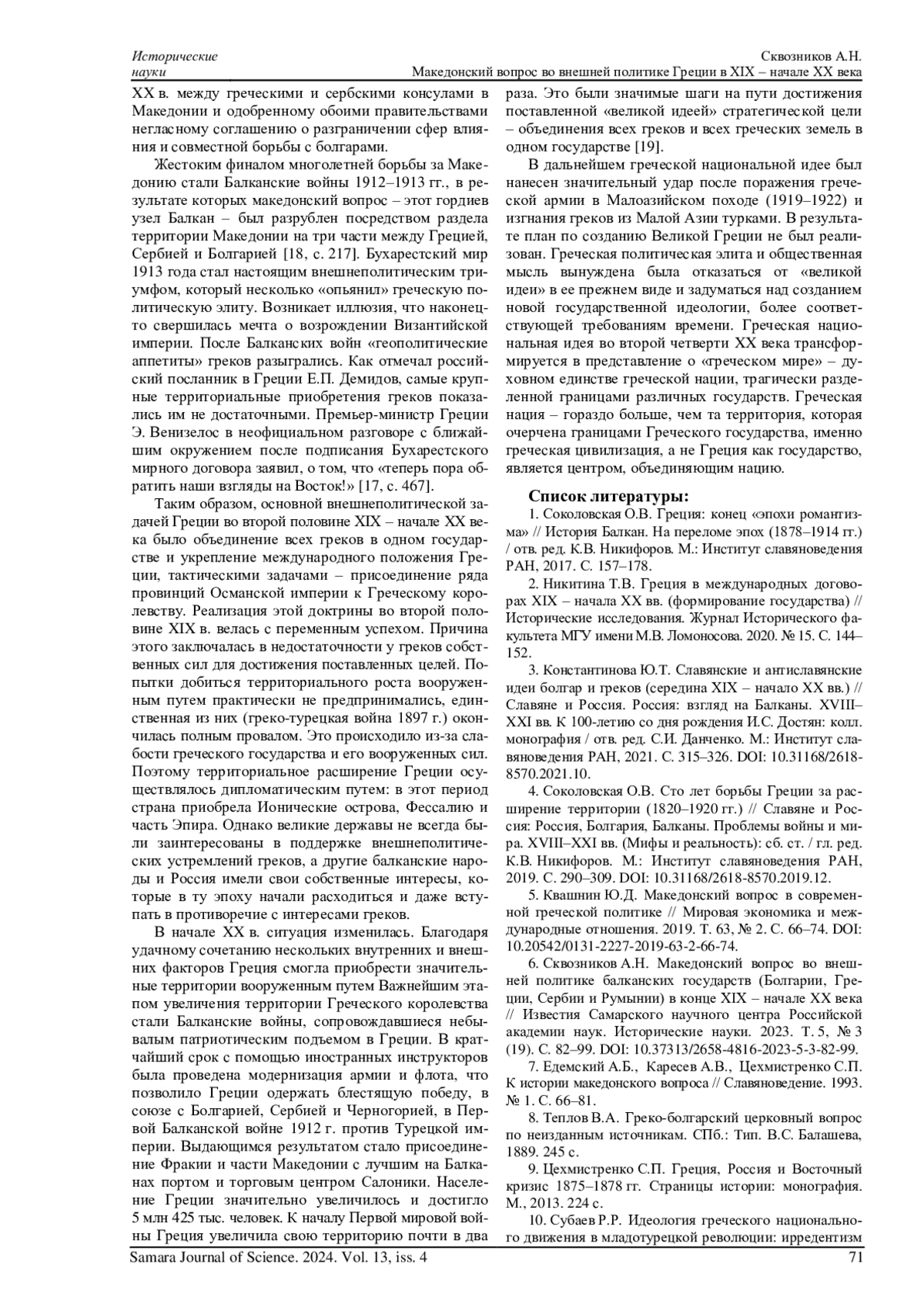 6. 	Сквозников А.Н. Македонский вопрос во внешней политике балканских государств (Болгарии, Греции, Сербии и Румынии) в конце XIX - начале XX века // Известия Самарского научного центра Российской академии наук. Исторические науки. 2023. Т. 5, № 3 (19). С. 82-99. DOI: 10.37313/2658-4816-2023-5-3-82-99 EDN: HFIMSA