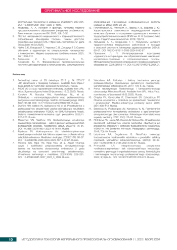 11. 	Беленова И. А., Подопригора А. В., Комарова Ю. Н. Формирование профессиональных компетенций ординаторов с использованием симуляционного оборудования. Прикладные информационные аспекты медицины. 2022; 25(1): 23-26.