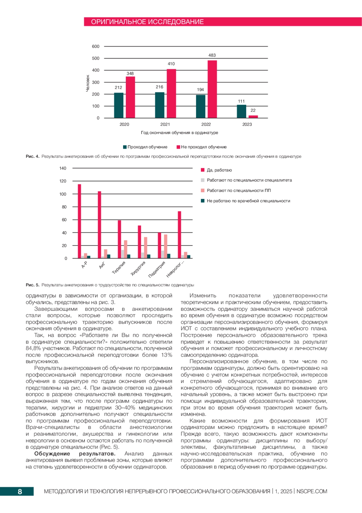В статье проведен анализ результатов анкетирования выпускников программ ординатуры, завершивших обучение в 2020–2023 годах, который позволил оценить удовлетворенность качеством обучения по программам ординатуры: теоретическим обучением, практической подготовкой, возможностью заниматься научными исследованиями в рамках программы ординатуры, а также востребованность полученных выпускниками теоретических знаний и практических навыков в дальнейшей практической деятельности на рабочем месте. Анализ анкет дал возможность выявить и обозначить проблемные вопросы обучения, которые оказывают влияние на последующую работу выпускника по специальности ординатуры, а также предложить пути решения для улучшения показателей удовлетворенности теоретическим и практическим обучением путем предоставления ординатору возможности персонализированного обучения с формированием индивидуальной образовательной траектории (ИОТ), в том числе интегрированного обучения по программам ординатуры и программам подготовки научных и научно-педагогических кадров в аспирантуре — интегрированного обучения «ординатура-аспирантура» или подготовки к «рабочему месту» — ИОТ для ординаторов, обучающихся по договорам о целевом обучении.