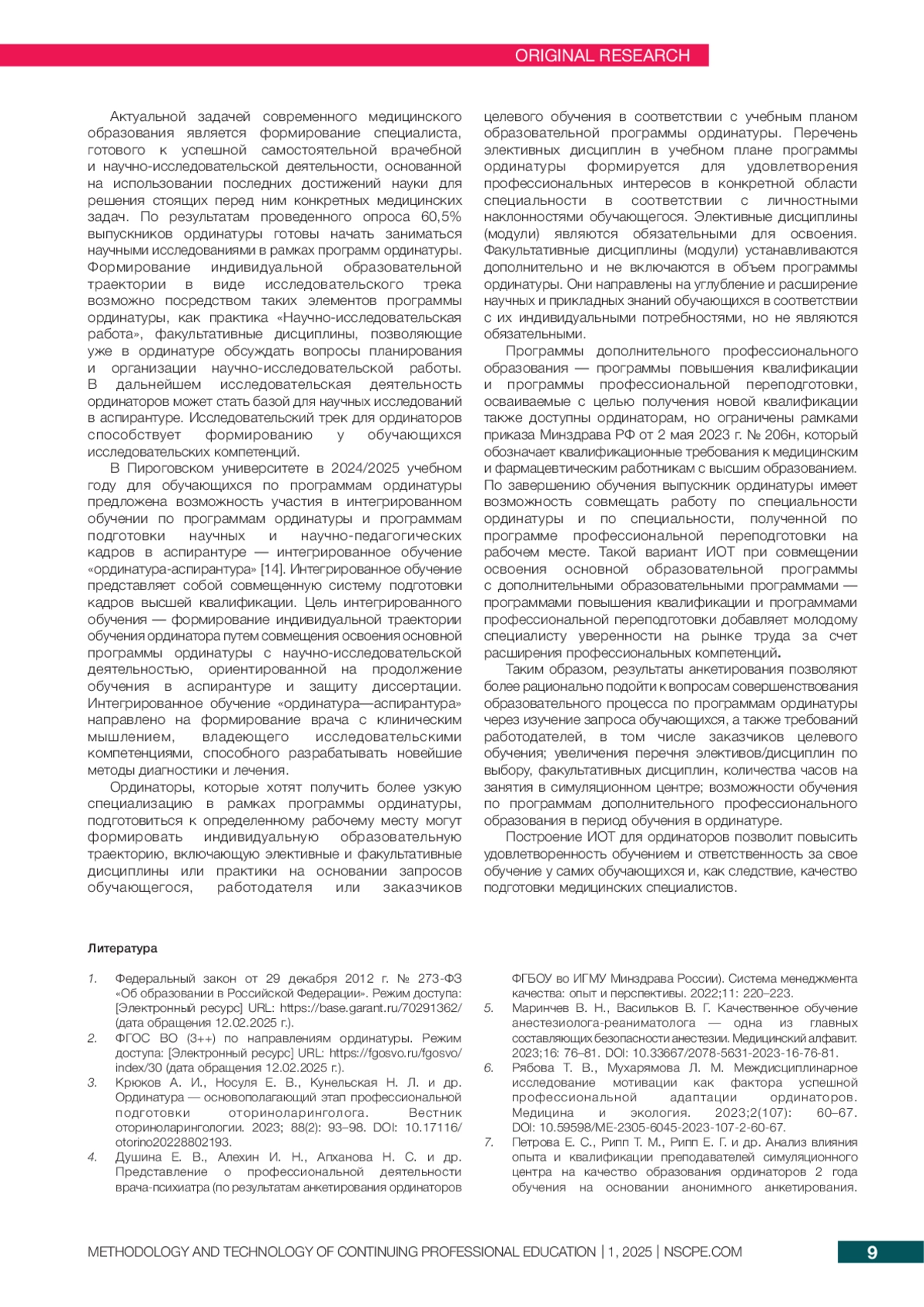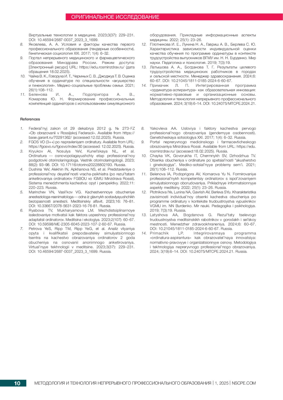 3. 	Крюков А. И., Носуля Е. В., Кунельская Н. Л. и др. Ординатура - основополагающий этап профессиональной подготовки оториноларинголога. Вестник оториноларингологии. 2023; 88(2): 93-98. DOI: 10.17116/otorino20228802193