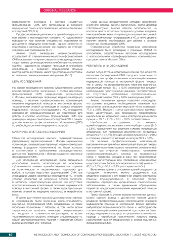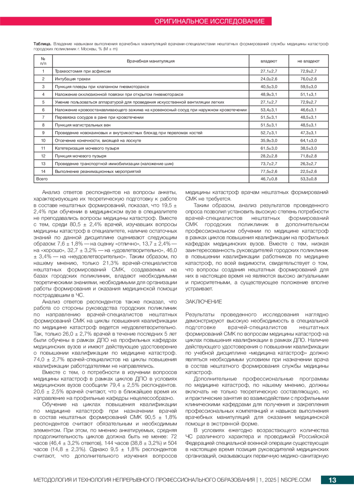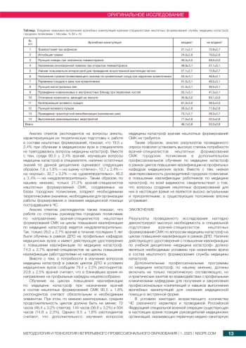 К врачам-специалистам, участвующим в ликвидации медико-санитарных последствий чрезвычайных ситуаций, предъявляются высокие требования в отношении их специальной подготовки. Цель исследования — установить уровень профессиональных компетенций оказания медицинской помощи в экстренной форме и определить потребность в обучении на циклах повышения квалификации по медицине катастроф у врачей нештатных формирований службы медицины катастроф (СМК) городских поликлиник. Сбор данных осуществлялся методом анонимного анкетного опроса, объем выборки составил 262 человека. При проведении исследования установлено, что только 46,7% респондентов владеют необходимыми практическими навыками, наибольшие затруднения вызывают интубация трахеи (24,0%), трахеостомия при асфиксии и умение пользоваться аппаратурой для проведения искусственной вентиляции легких (по 27,1%). Также выявлена высокая степень потребности врачей-специалистов в дополнительном профессиональном обучении по медицине катастроф в рамках циклов повышения квалификации: только 26,0% врачей в течение последних 5 лет были обучены по медицине катастроф в рамках дополнительного профессионального образования, о потребности в изучении вопросов медицины катастроф сообщили 79,4% респондентов. Таким образом, укомплектование нештатных формирований СМК должно осуществляться только врачами-специалистами, прошедшими обучение по медицине катастроф. При разработке дополнительных профессиональных программ по медицине катастроф целесообразно предусматривать взаимодействие кафедр медицины катастроф с профильными клиническими кафедрами для закрепления навыков выполнения врачебных манипуляций для оказания экстренной медицинской помощи.