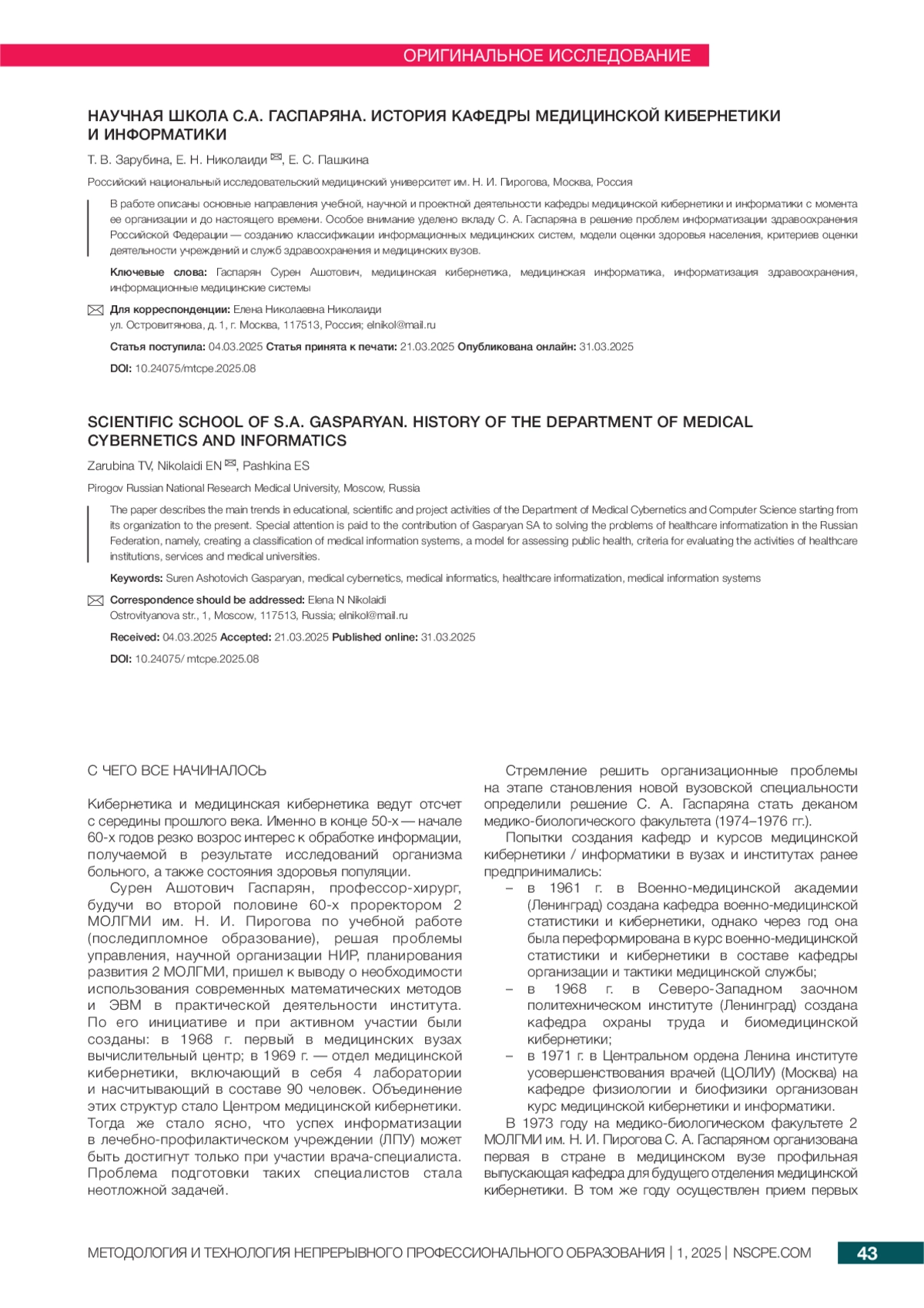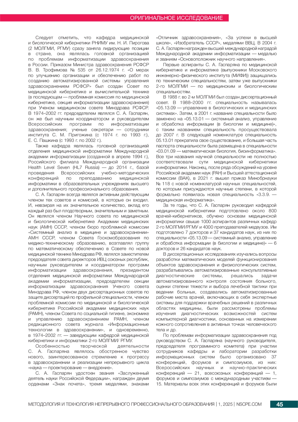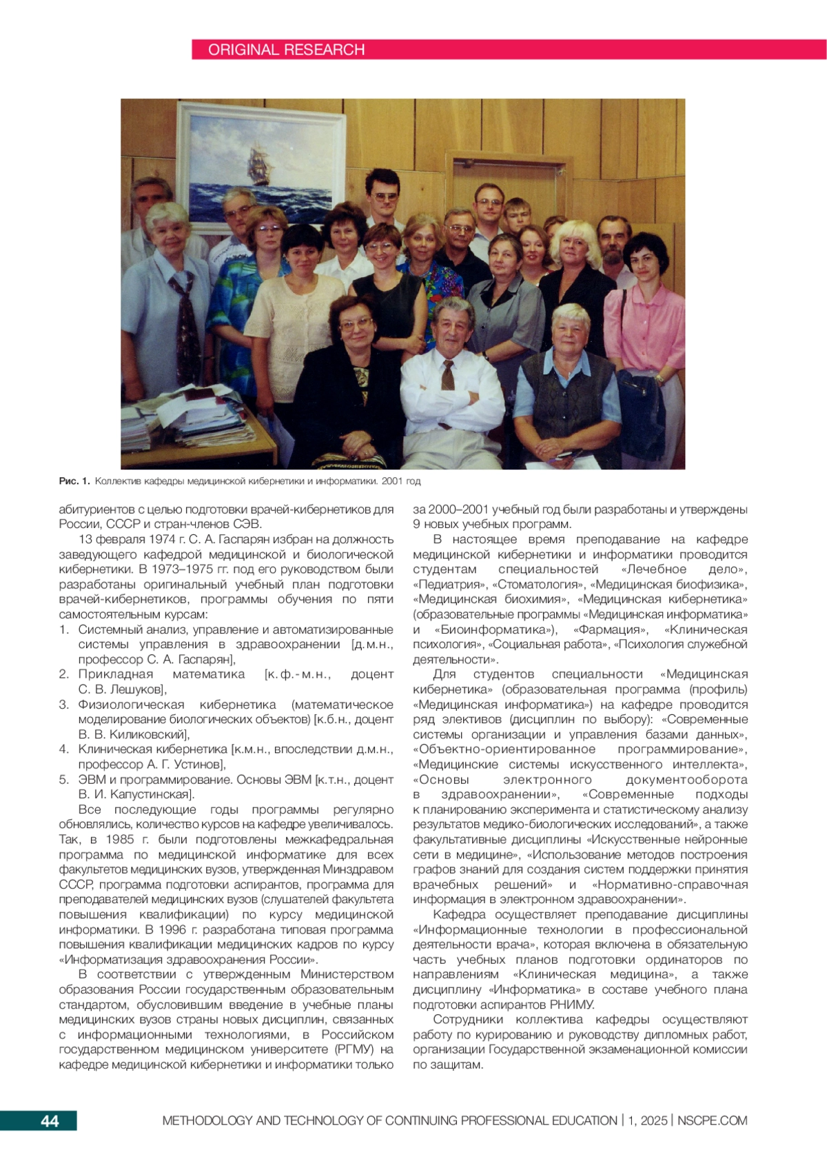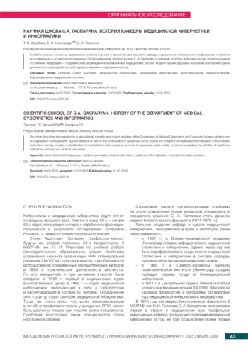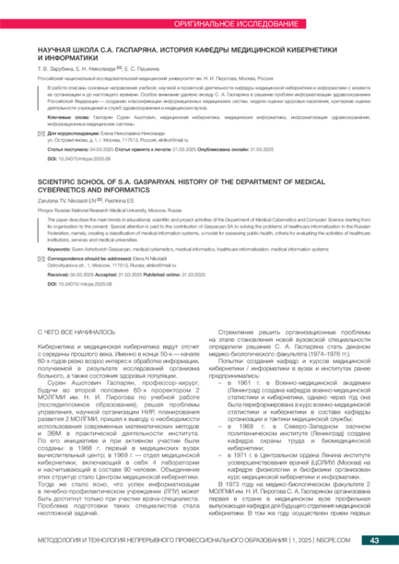работе описаны основные направления учебной, научной и проектной деятельности кафедры медицинской кибернетики и информатики с момента ее организации и до настоящего времени. Особое внимание уделено вкладу С. А. Гаспаряна в решение проблем информатизации здравоохранения Российской Федерации — созданию классификации информационных медицинских систем, модели оценки здоровья населения, критериев оценки деятельности учреждений и служб здравоохранения и медицинских вузов.