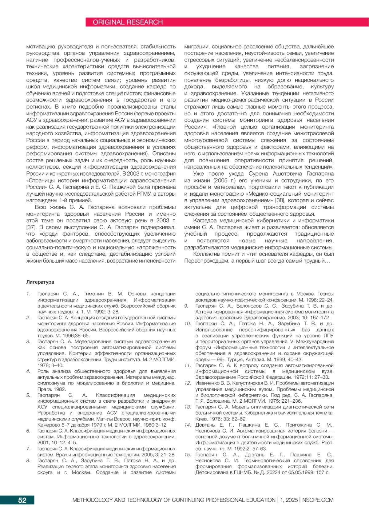 37. 	Гаспарян, С. А. Медико-социальный мониторинг в управлении здравоохранением. Актовая речь. / С. А. Гаспарян. - М.: РГМУ, 2003. - 39 c.