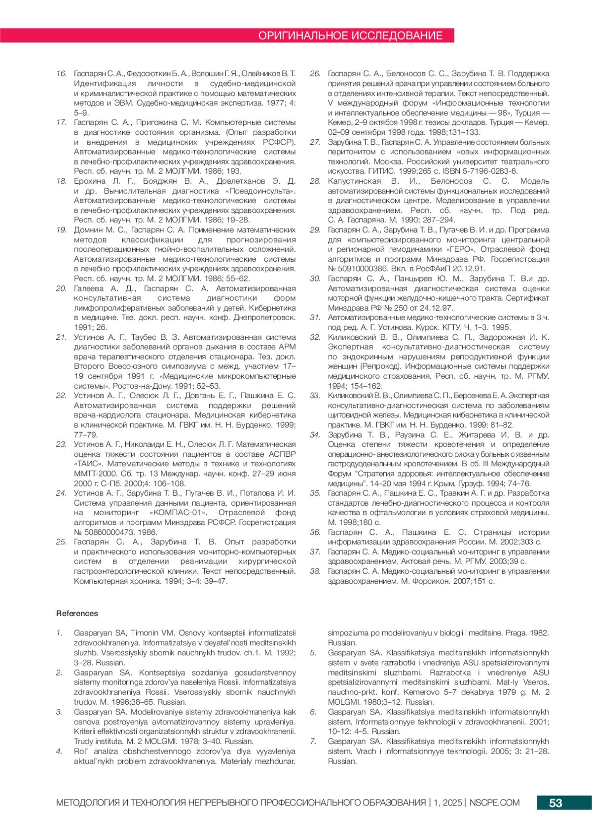 5. 	Гаспарян С.А. Классификация медицинских информационных систем в свете разработки и внедрения АСУ специализированными медицинскими службами / С. А. Гаспарян // Разработка и внедрение АСУ специализированными медицинскими службами. Мат-лы Всерос. научно-пркт. конф., Кемерово 5-7 декабря 1979 г. - М.: 2 МОЛГМИ. - 1980. - С.3-12.