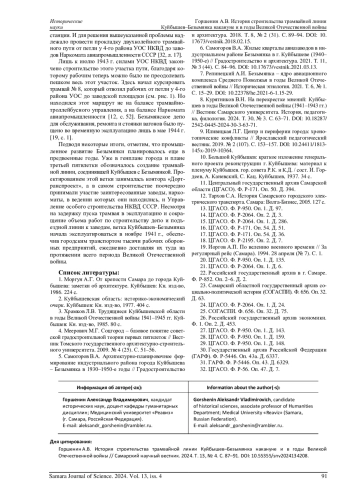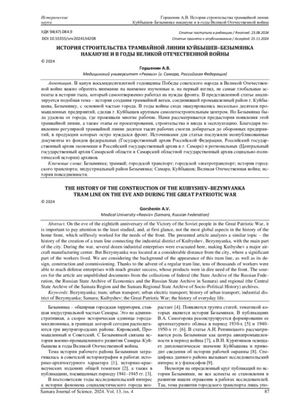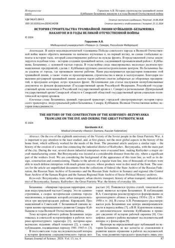 В канун восьмидесятилетней годовщины Победы советского народа в Великой Отечественной войне важно обратить внимание на наименее изученные и, на первый взгляд, не самые глобальные аспекты в истории тыла, который самоотверженно работал на нужды фронта. В представленной статье анализируется подобная тема - история создания трамвайной ветки, соединявшей промышленный район г. Куйбышева, Безымянку, с основной частью города. В годы войны сюда эвакуировались несколько десятков промышленных предприятий, сделав г. Куйбышев крупным самолетостроительным центром. Но Безымянка была удалена от города, где проживали многие рабочие. Нами рассматривается предыстория появления этой трамвайной линии, а также этапы ее проектирования, строительства и ввода в эксплуатацию. Благодаря появлению регулярной трамвайной линии десятки тысяч рабочих смогли добираться до оборонных предприятий, в продукции которых остро нуждался фронт. Источниками для статьи послужили неопубликованные документы из фондов федеральных (Государственный архив Российской Федерации, Российский государственный архив экономики и Российский государственный архив в г. Самаре) и региональных (Центральный государственный архив Самарской области и Самарский областной государственный архив социально-политической истории) архивов.
