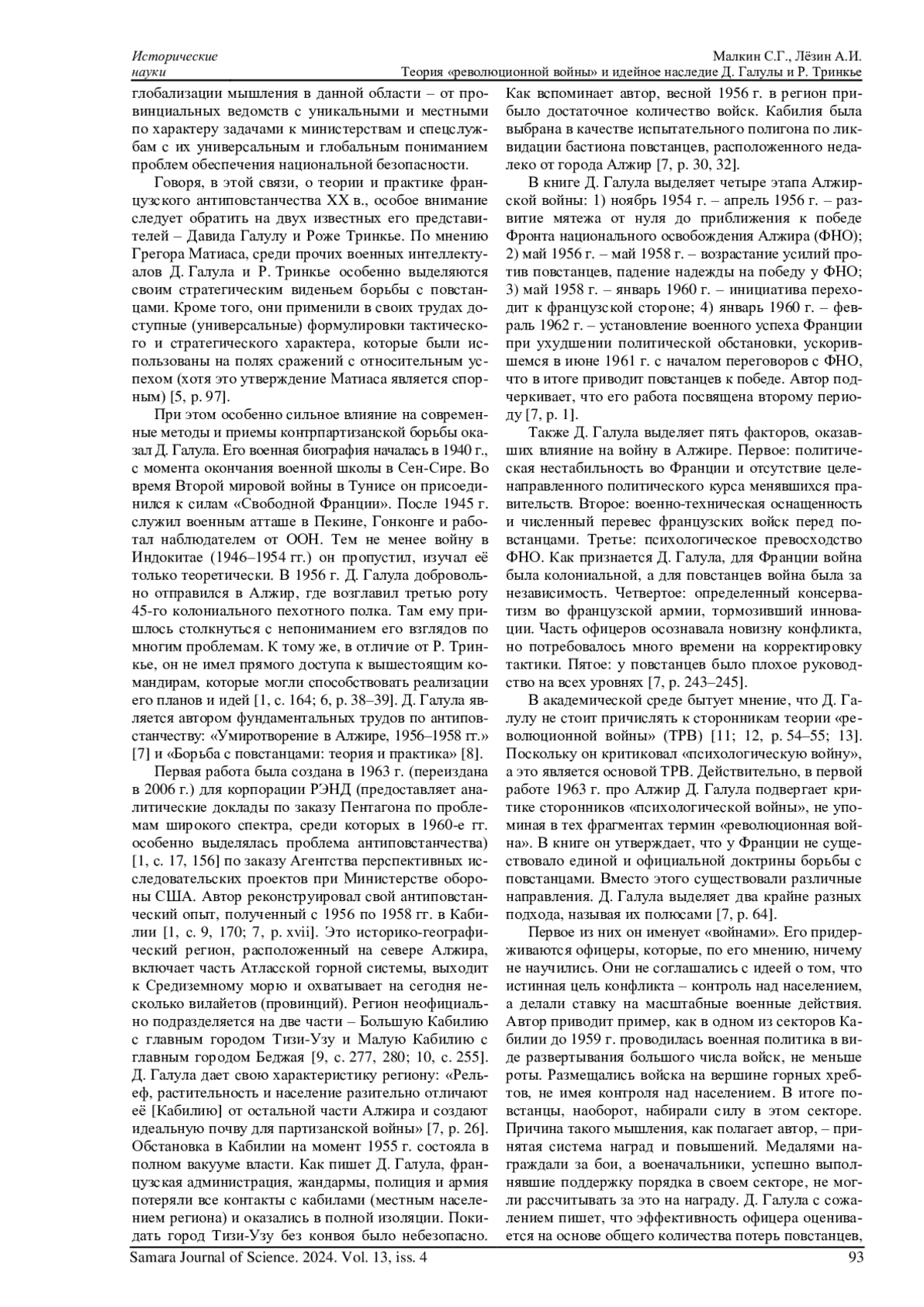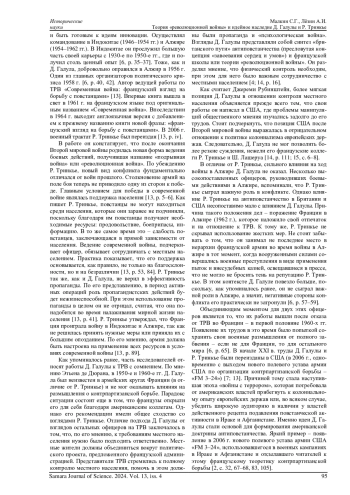 В представленной статье теория «революционной войны» и её влияние на вооружённые силы Франции в эпоху деколонизации после Второй мировой войны рассматриваются сквозь призму идейно-теоретического наследия двух наиболее известных представителей «французской школы» колониального антиповстанчества второй половины XX в. - Давида Галулы и Роже Тринкье. Разбираются расхождения и сходства теории «революционной войны» и основных положений военно-теоретических работ Д. Галулы и Р. Тринкье в контексте становления и последовавшего вскоре отказа от нее в среде французского военного класса в 1950-е-60-е гг. В этой связи в работе затрагивается не только специфика восприятия офицерами колониальной службы в данный исторический период событий на зависимых территориях и в метрополии, но и их корреляция с представлениями Д. Галулы и Р. Тринкье в рамках контрпартизанской борьбы. Особое внимание уделено характерным особенностям исследовательской оптики рассмотрения ими действий французской армии в Индокитае (1946-1954 гг.) и Алжире (1954-1962 гг.), включая представления о допустимых пределах применения силы и роли армии и гражданских служб в обеспечении колониального порядка, в контексте теории «революционной войны».