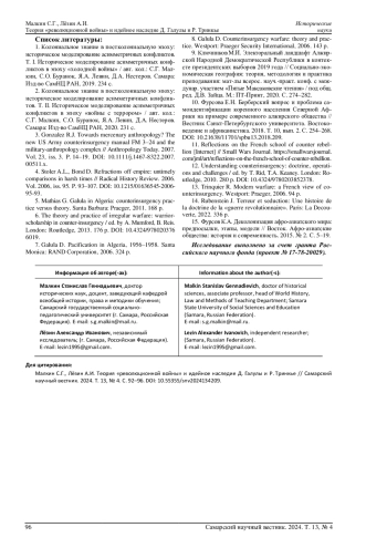 2. 	Колониальное знание в постколониальную эпоху: историческое моделирование асимметричных конфликтов. Т. II. Историческое моделирование асимметричных конфликтов в эпоху “войны с террором” / авт. кол.: С.Г. Малкин, С.О. Буранок, Я.А. Левин, Д.А. Нестеров. Самара: Изд-во СамНЦ РАН, 2020. 231 с.