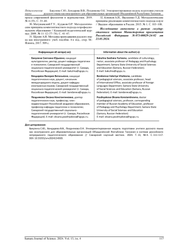 В статье обосновывается, что в условиях изменяющейся международной обстановки распространение русского языка является важным инструментом укрепления позиций России на мировой арене и формирования положительного имиджа страны. Аргументируется необходимость разработки этноориентированной модели подготовки учителя русского языка как иностранного для образовательных организаций Объединённой Республике Танзания в системе российского непрерывного педагогического образования, нацеленной (модель) на кадровое обеспечение процесса преподавания РКИ в Танзании с учетом специфики национальной системы образования страны, а также этнокультурных особенностей целевой аудитории. Доказывается, что разрабатываемая модель являет собой нормативную модель, отражающую представления о том, какими должны быть содержание, приемы, формы и средства организации образовательного процесса, обеспечивающие эффективную профессиональную подготовку учителей русского языка как иностранного для образовательных организаций Танзании из числа танзанийцев, обучающихся в России. Определяются приоритетные функции модели: объяснительная, иллюстративная, информационная и проективная функции. Обосновывается блочная структура модели и раскрывается содержание целевого, аналитико-диагностического, мотивационного, методологического, содержательного, методического и результативно-перспективного блоков. Раскрывается сущность этноориентированного, культурологического, аксиологического, коммуникативного и компетентностного подходов к организации подготовки учителя русского языка как иностранного для образовательных организаций Объединённой Республики Танзания в системе российского непрерывного педагогического образования и выявляются принципы реализации подходов: принцип национальной контекстности обучения, принцип учета национально-личностных характеристик обучающихся, принцип учета особенностей национальной системы образования обучающихся, принцип адаптационной направленности обучения РКИ иностранных студентов в системе российского образования, принцип международной интеграции, программно-целевой принцип, принцип учета родного языка и культуры обучающихся (этноориентированный подход); принцип диалога культур, принцип культуросообразности (культурологический подход); принцип ценностной ориентации, принцип субъектности (аксиологический подход); принцип функциональности, принцип новизны (коммуникативный подход); принцип дидактической последовательности, принцип личностной ориентированности (компетентностный подход).