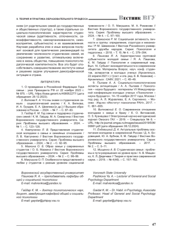 5. 	Мазкина О. Б. Образ семьи у современных студентов / О. Б. Мазкина // Вестник Воронежского государственного университета. Серия: Проблемы высшего образования. - 2024. - № 2. - С. 96-99. EDN: ESINSE