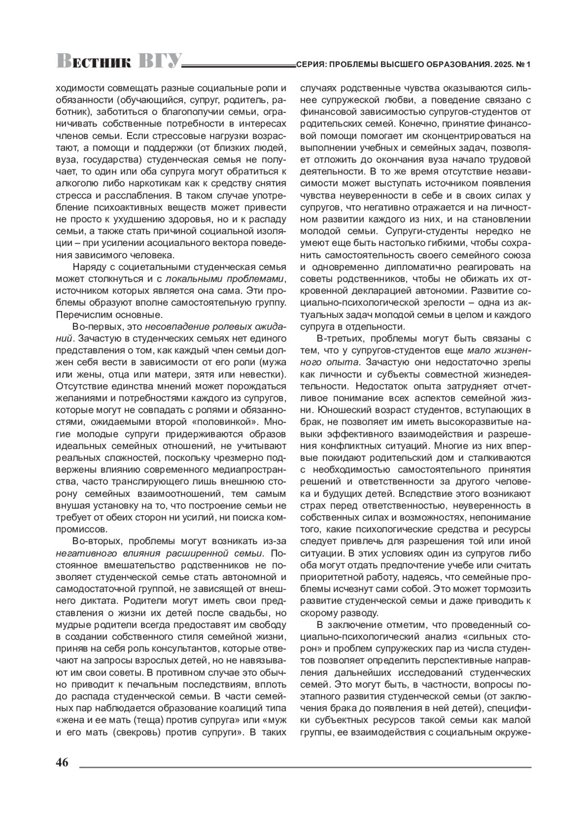 В статье анализируется актуальность социально-психологического исследования студенческих семей в современном российском обществе, поскольку они служат важным социальным ресурсом развития института семьи в России. Охарактеризованы такие «сильные стороны» студенческой семьи, позволяющие ей преодолевать вызовы современности, как: социальная активность, мобильность и открытость новому опыту, идентичность жизненных целей и установок молодых супругов, социальный оптимизм, социальное равенство, антиципационные способности как «взгляд в будущее». Вместе с тем обращается внимание на то, что студенческая семья сталкивается с социетальными (имеющими внешние источники и причины) и локальными (имеющими внутрисемейную природу) проблемами, что требует от нее определенного уровня социально-психологической зрелости, позволяющей находить конструктивные способы их преодоления.