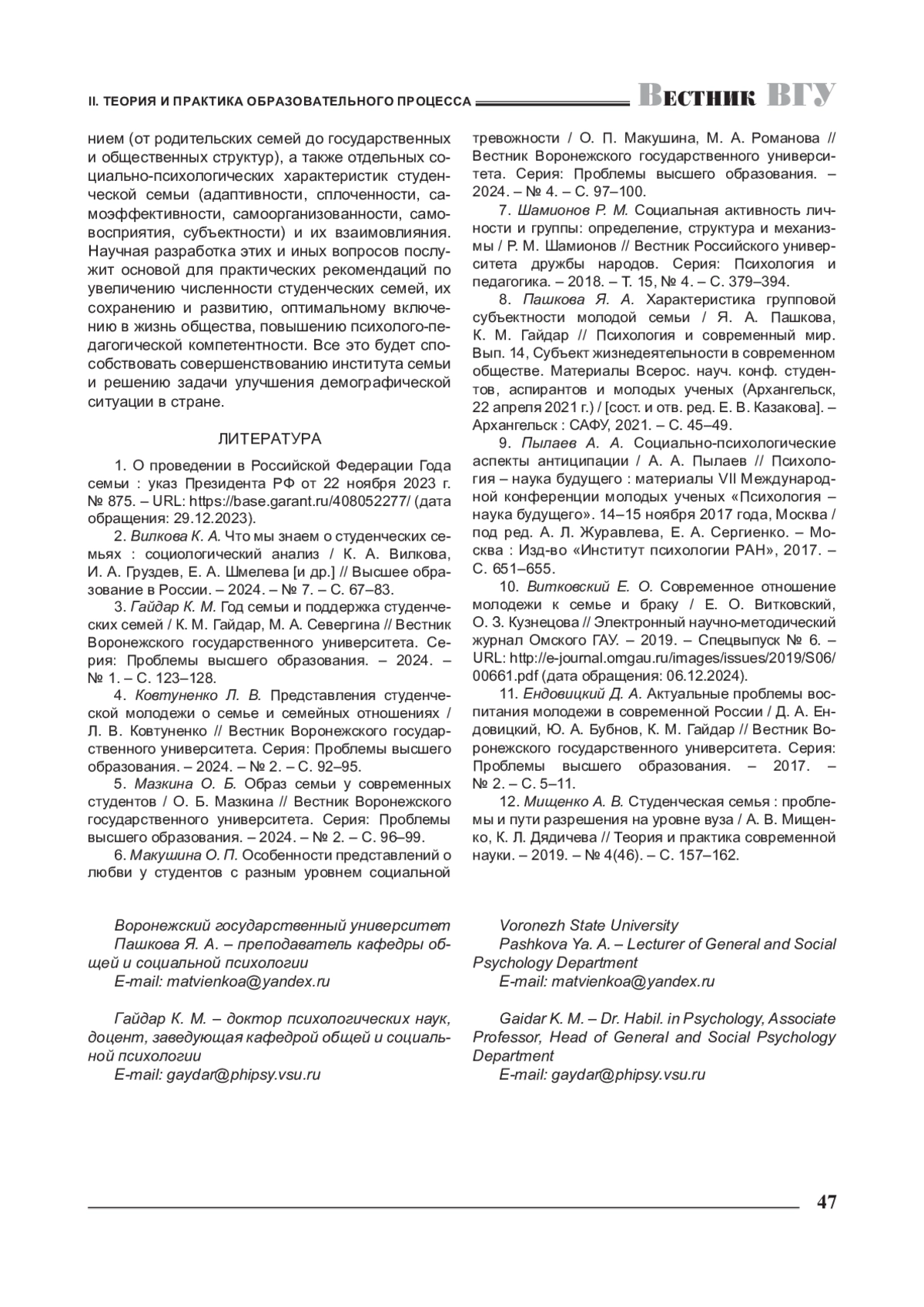 3. 	Гайдар К. М. Год семьи и поддержка студенческих семей / К. М. Гайдар, М. А. Севергина // Вестник Воронежского государственного университета. Серия: Проблемы высшего образования. - 2024. -№ 1.-С. 123-128. EDN: WWGUIW