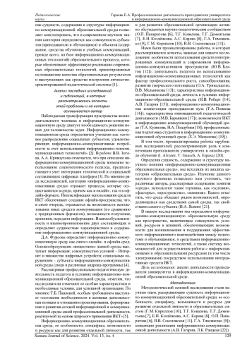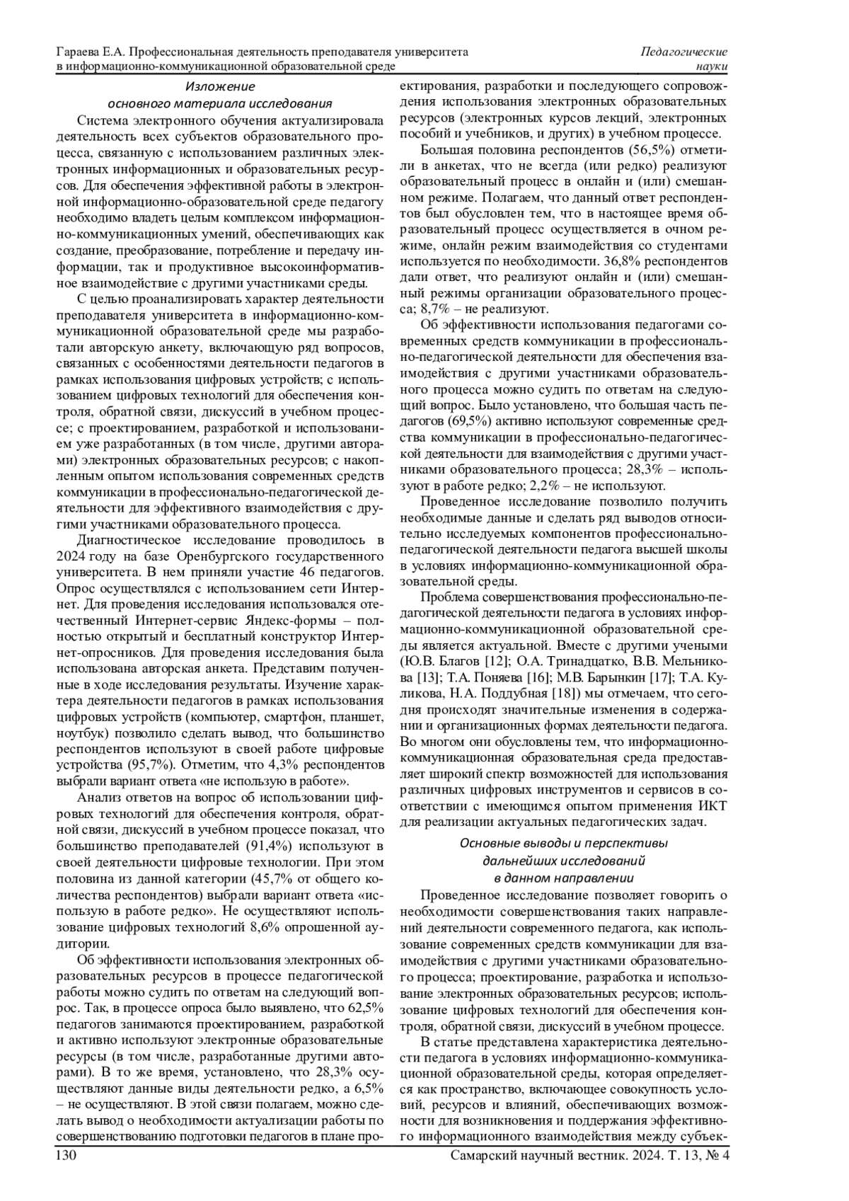 Актуальность настоящего исследования обусловлена активным внедрением в образовательную среду информационно-коммуникационных технологий, что, в свою очередь, определяет необходимость детального рассмотрения вопросов и механизмов совершенствования деятельности преподавателя университета, непосредственно связанной с их реализацией, - информационно-коммуникационной деятельности. В статье проанализированы аспекты профессионально-педагогической деятельности педагога высшей школы в условиях информационно-коммуникационной образовательной среды. Представлены результаты исследования, нацеленного на выявление характера деятельности педагогов в рамках использования цифровых устройств (компьютер, смартфон, планшет, ноутбук); особенностей использования цифровых технологий для обеспечения контроля, обратной связи, дискуссий в учебном процессе; особенностей деятельности, связанной с проектированием, разработкой и использованием уже созданных (в том числе, другими авторами) электронных образовательных ресурсов; возможностей и характера организации образовательного процесса в онлайн и (или) смешанном режиме; опыта использования преподавателями современных средств коммуникации в профессионально-педагогической деятельности для эффективного взаимодействия с другими участниками образовательного процесса. Результаты проведенного исследования, их детальный анализ и полученные выводы могут быть использованы в научной и педагогической деятельности с целью рассмотрения и дальнейшего изучения процесса профессионального и личностного развития преподавателя университета как субъекта информационно-коммуникационной деятельности.