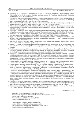 32. Чебаненко С.Б. За чьё убийство взималась вира во времена Владимира Святославича: “и реша епископи и старци.”. // Палеоросия. Древняя Русь: во времени, в личностях, в идеях. 2021. № 3 (15). С. 37-57.