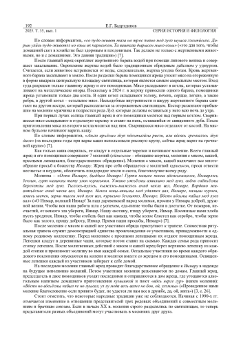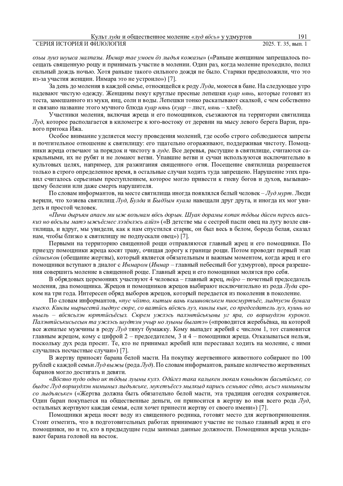 В статье анализируется современное состояние культа Луда у удмуртов на примере общественного моления « Луд вӧсь » в деревне Кузебаево Алнашского района Удмуртской Республики. Жители этой деревни в настоящее время сумели сохранить традиционные религиозные верования и делятся на три социально-культовых объединения: роды святилищ « Луд », « Булда » и « Быдӟым куала ». В последние годы в традиционной этнической религии удмуртов наблюдаются процессы модернизации, которые в целом приводят к упрощению обрядовой стороны культа, что вызывает потребность в изучении динамики современной культовой практики и актуализации уже имеющихся данных. На основе полевых материалов, собранных автором в ходе этнографической экспедиции в 2024 г., в статье описываются обрядовые церемонии поклонения Луду - божеству неосвоенного природного пространства, которые включают в себя подготовительный процесс к обряду моления «Луд вӧсь» и основные этапы его проведения, существующие запреты на посещение священной рощи луд, обряд выбора жрецов.